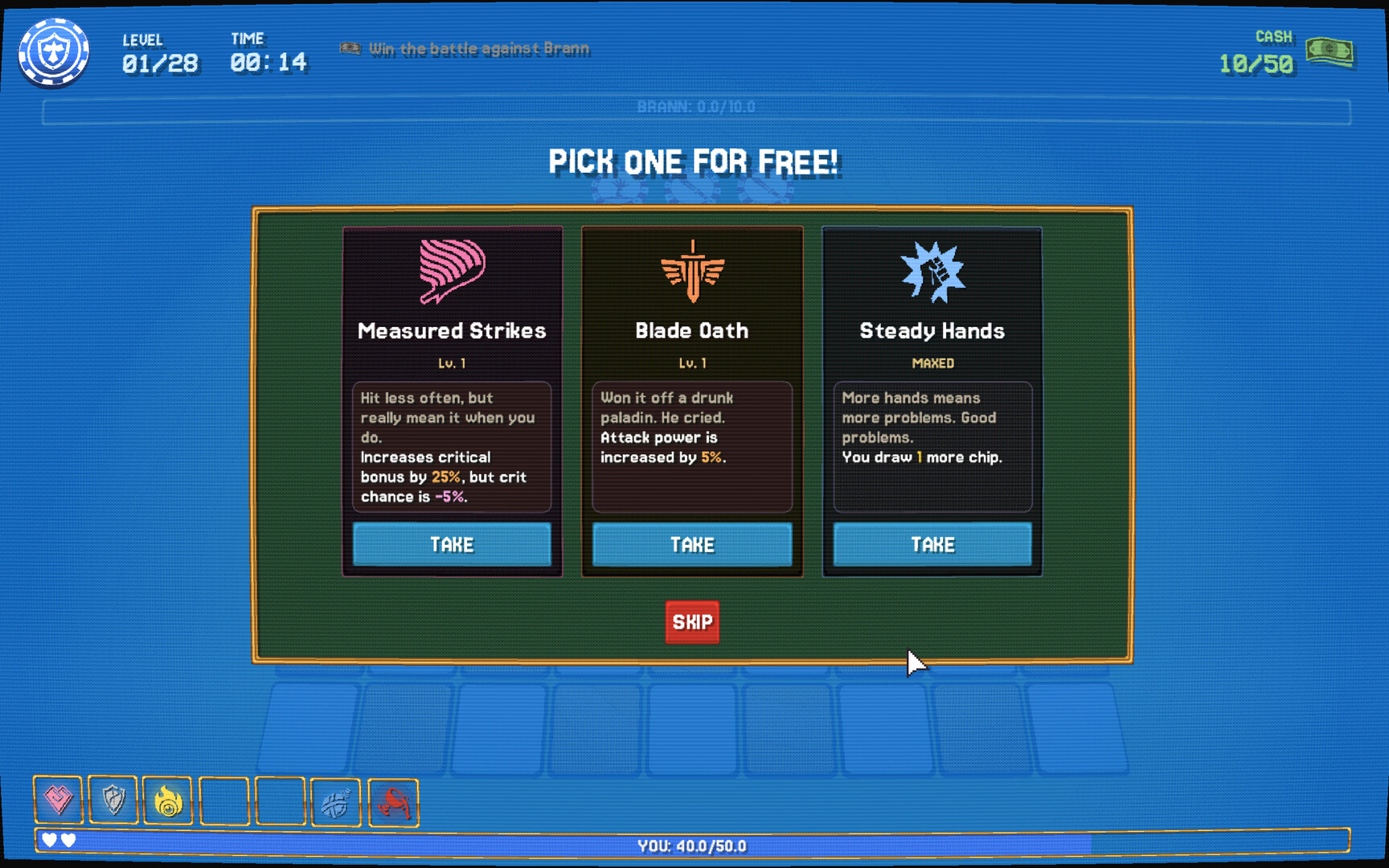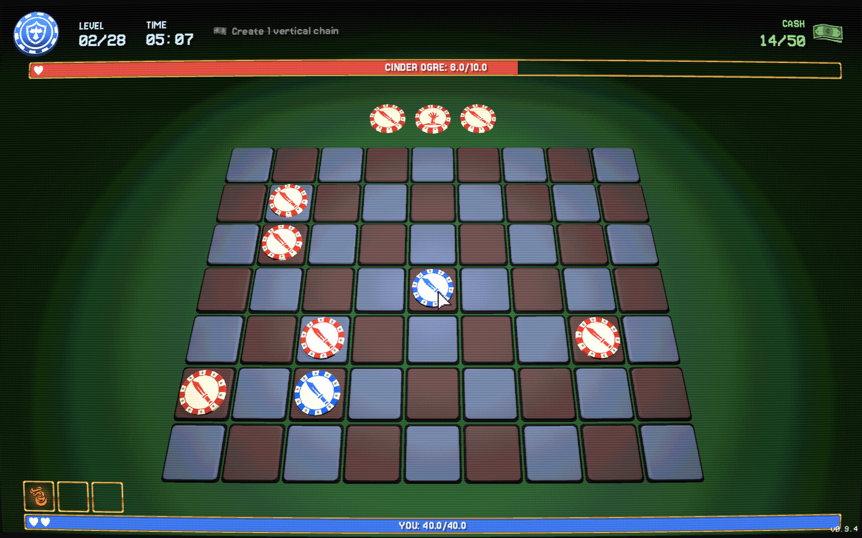 Chain-building roguelike where you deal damage by lining up magic chips in a row. Fight drunk ogres and loud knights, stack run-defining charms, drink powerful brews, and push your luck for devastating combos.
