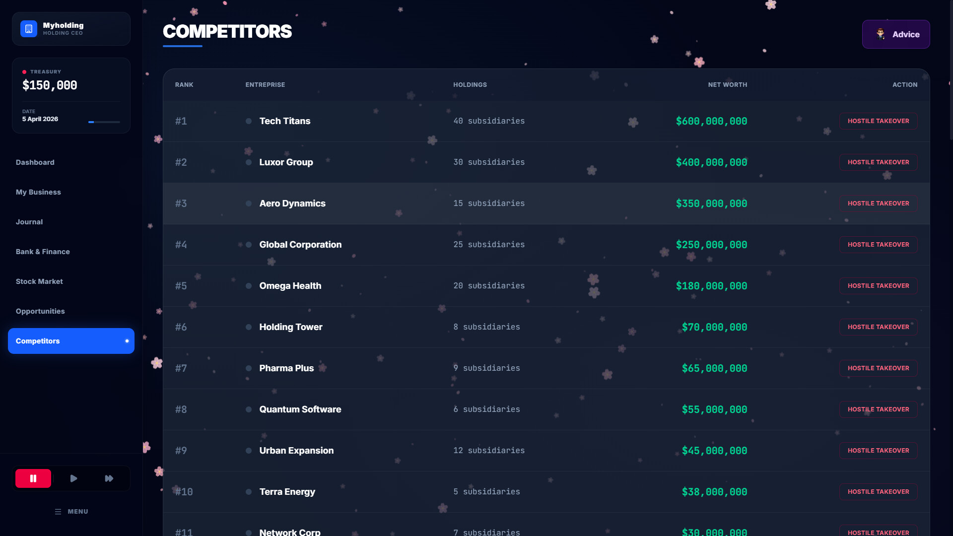 치열한 경쟁이 펼쳐지는 고위 금융계에 뛰어들어 차세대 글로벌 비즈니스 거물이 될 자질을 증명해 보세요.