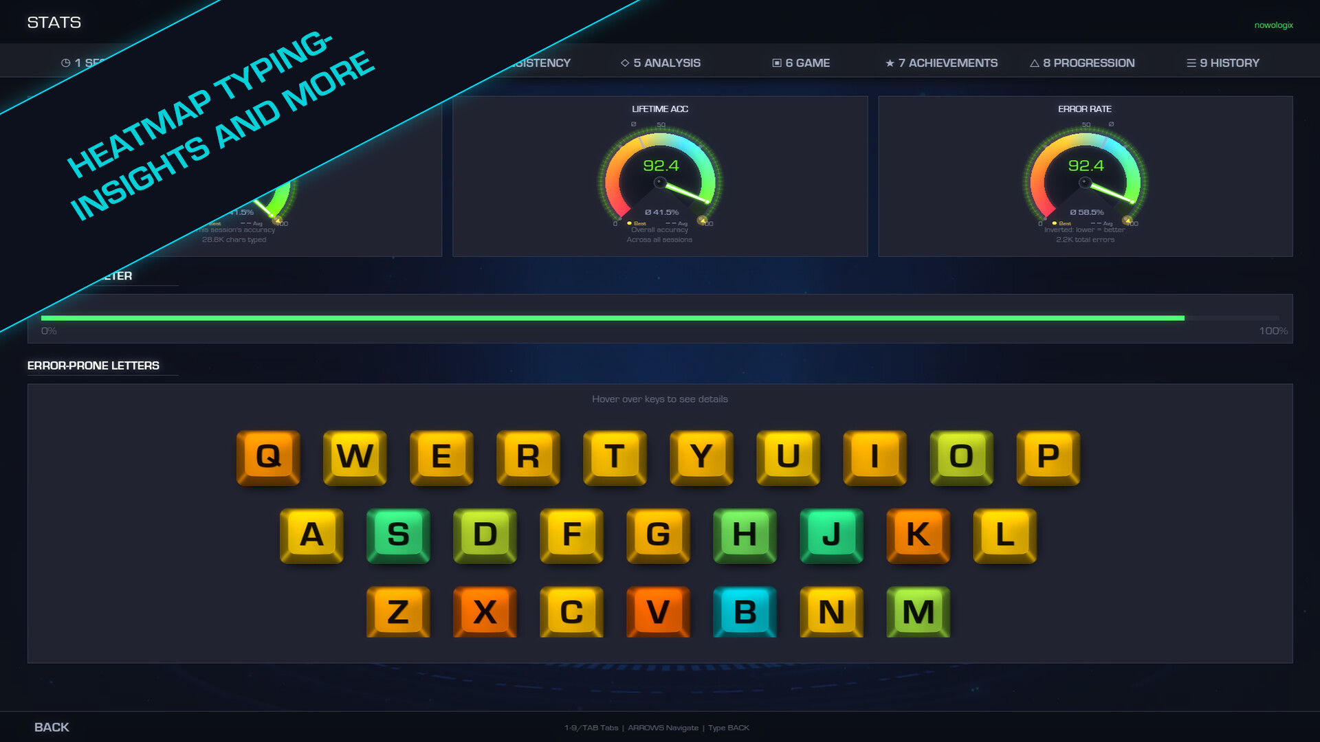 ...as everyone knows, at least since Monkeytype, these are essential. We, too, have our own algorithm that realistically tracks typing performance. We’ve also incorporated keyboard heatmaps, KPS, and global and session statistics. And when you’re in COMPETITIVE mode, online leaderboards are included, of course.