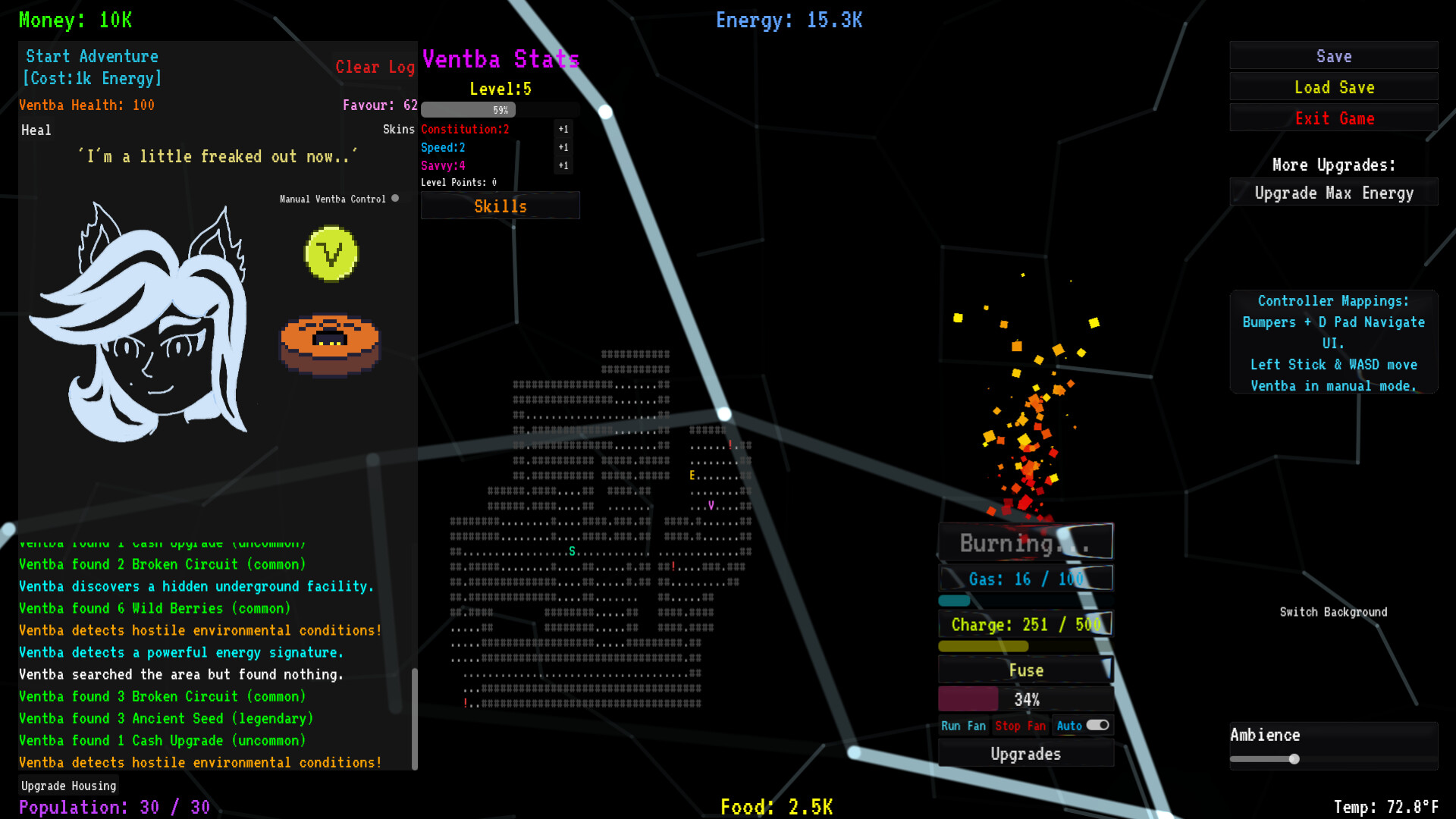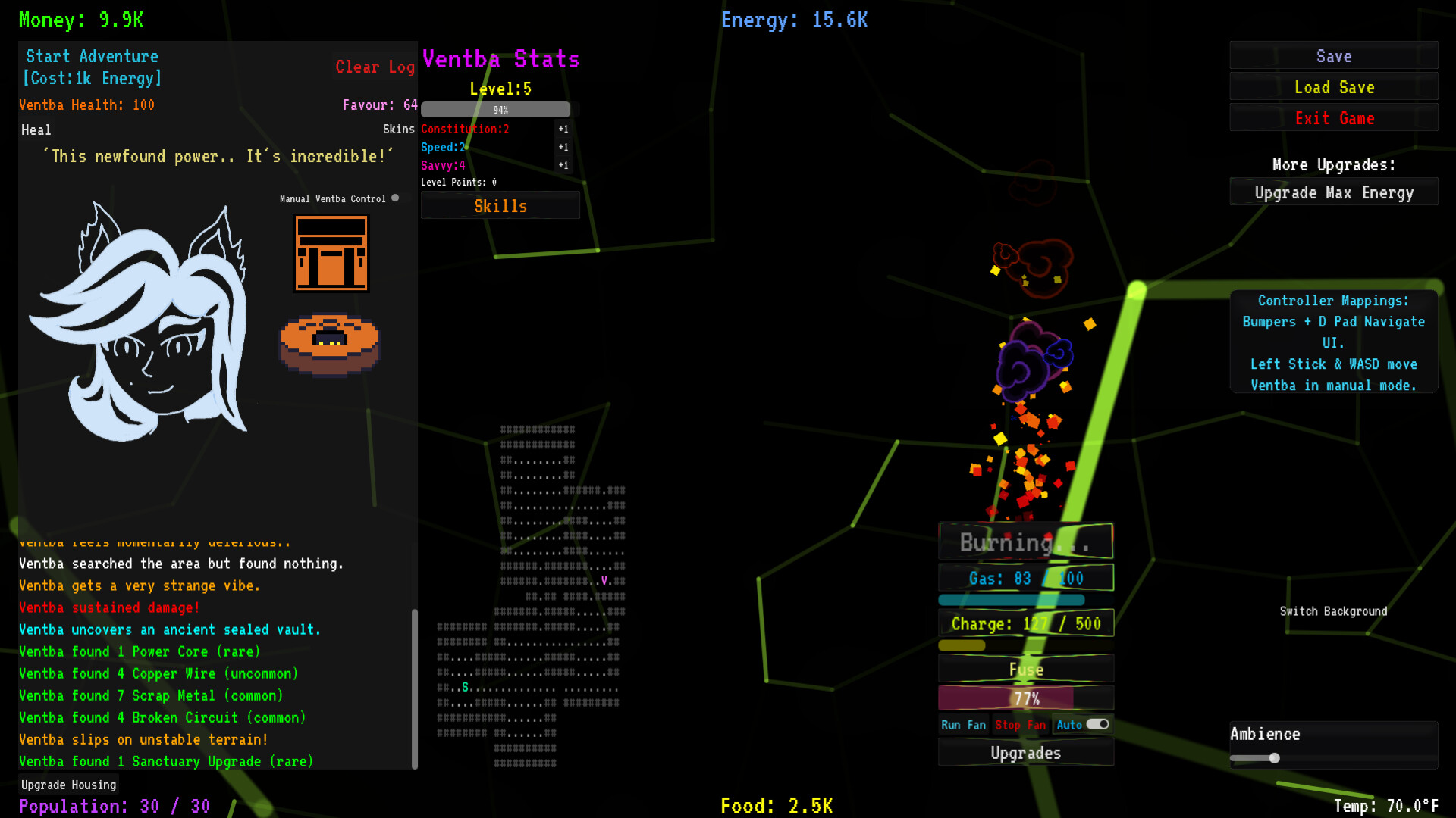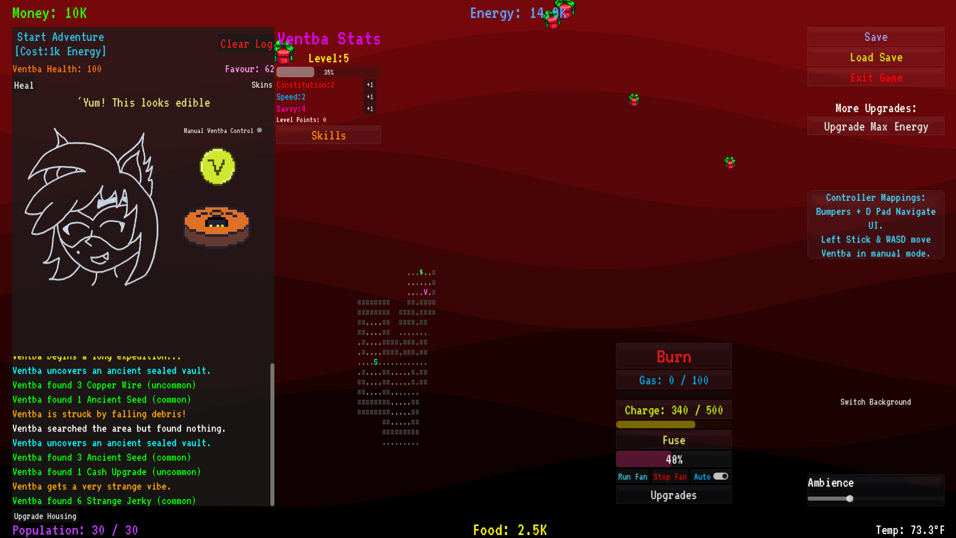Excess power can be used to send VENTBA out in the search for food and valuables. Valuables found give more money to purchase upgrades to the heating system and housing.