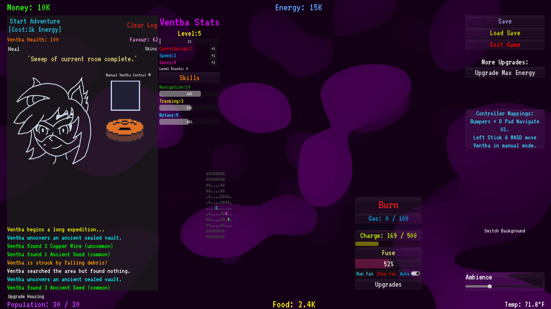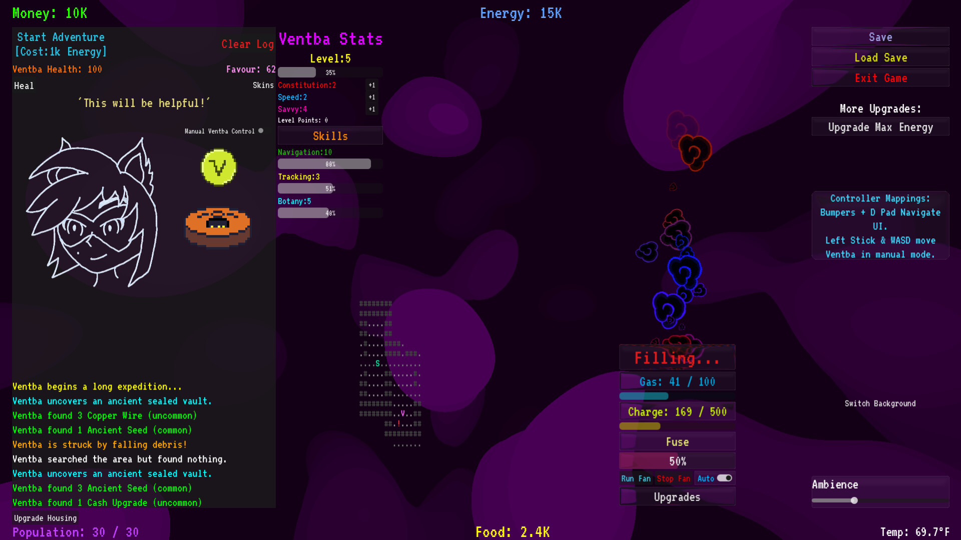 -During expeditions, Ventba will sometimes find temporary run upgrades to protect from damage and extend the journey length, giving a bit of roguelike depth to the adventures, with more upgrades being thought up and made as I develop the game!