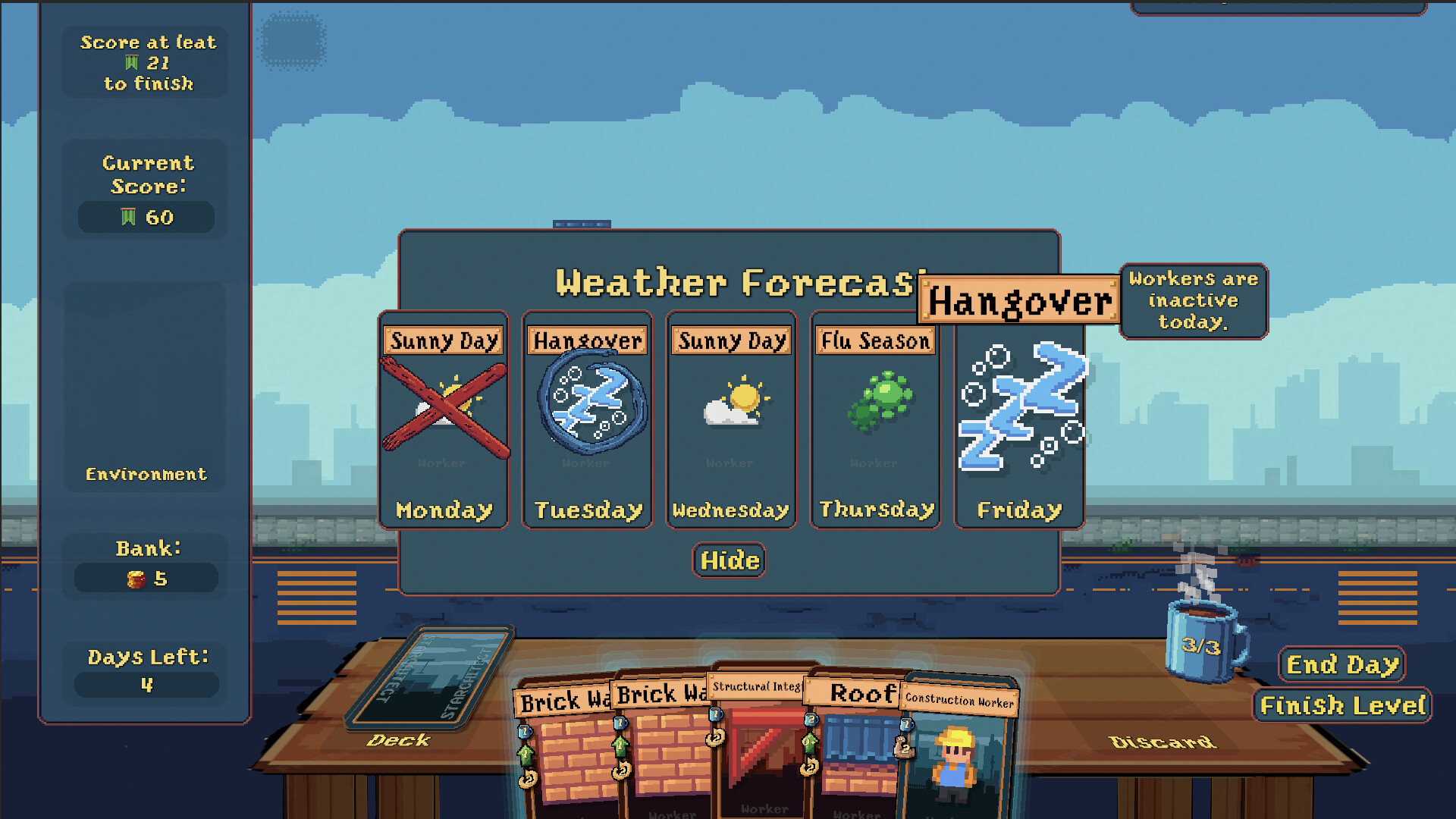 Starchitect is a cozy house-building deckbuilder about creating powerful synergies, outsmarting the devil with architecture, and designing chaotic buildings within the limits of a 6-block-wide construction site.