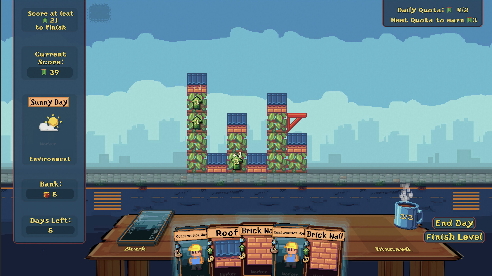 Starchitect puts the builder back into deckbuilders. Draft cards, upgrade your workers, and discover wild synergies to push your rating to the limit. Break the game or somehow fit your dream house onto a 6-block-wide construction site.