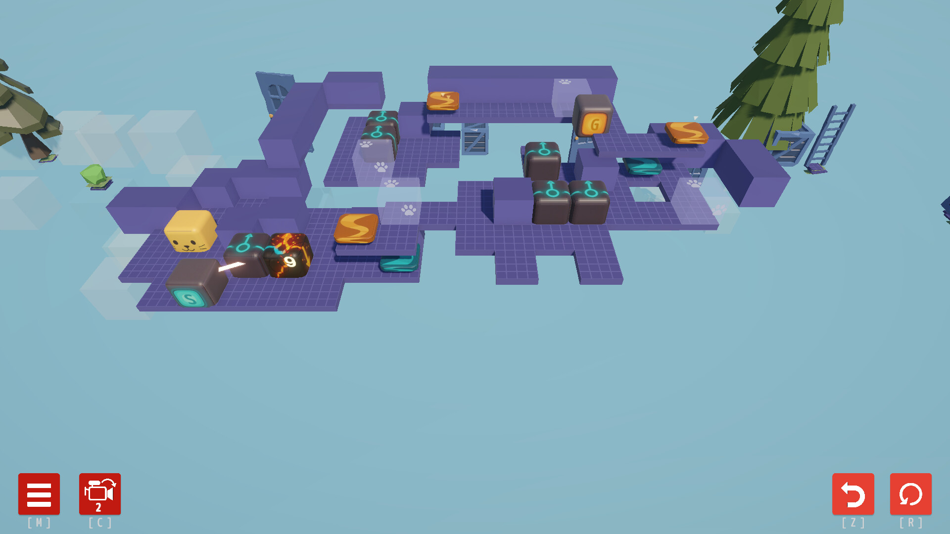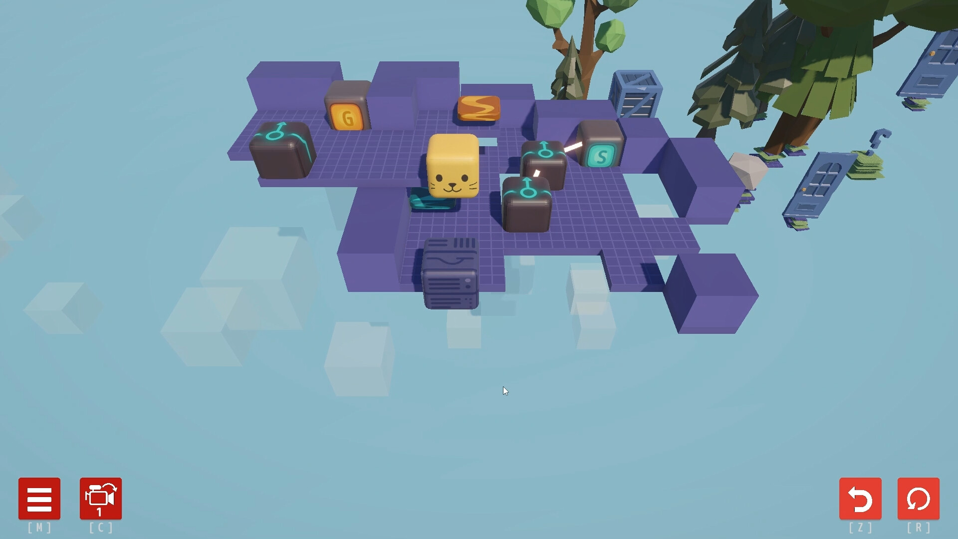 A cute yellow cube-shaped cat guides the player through the puzzles.