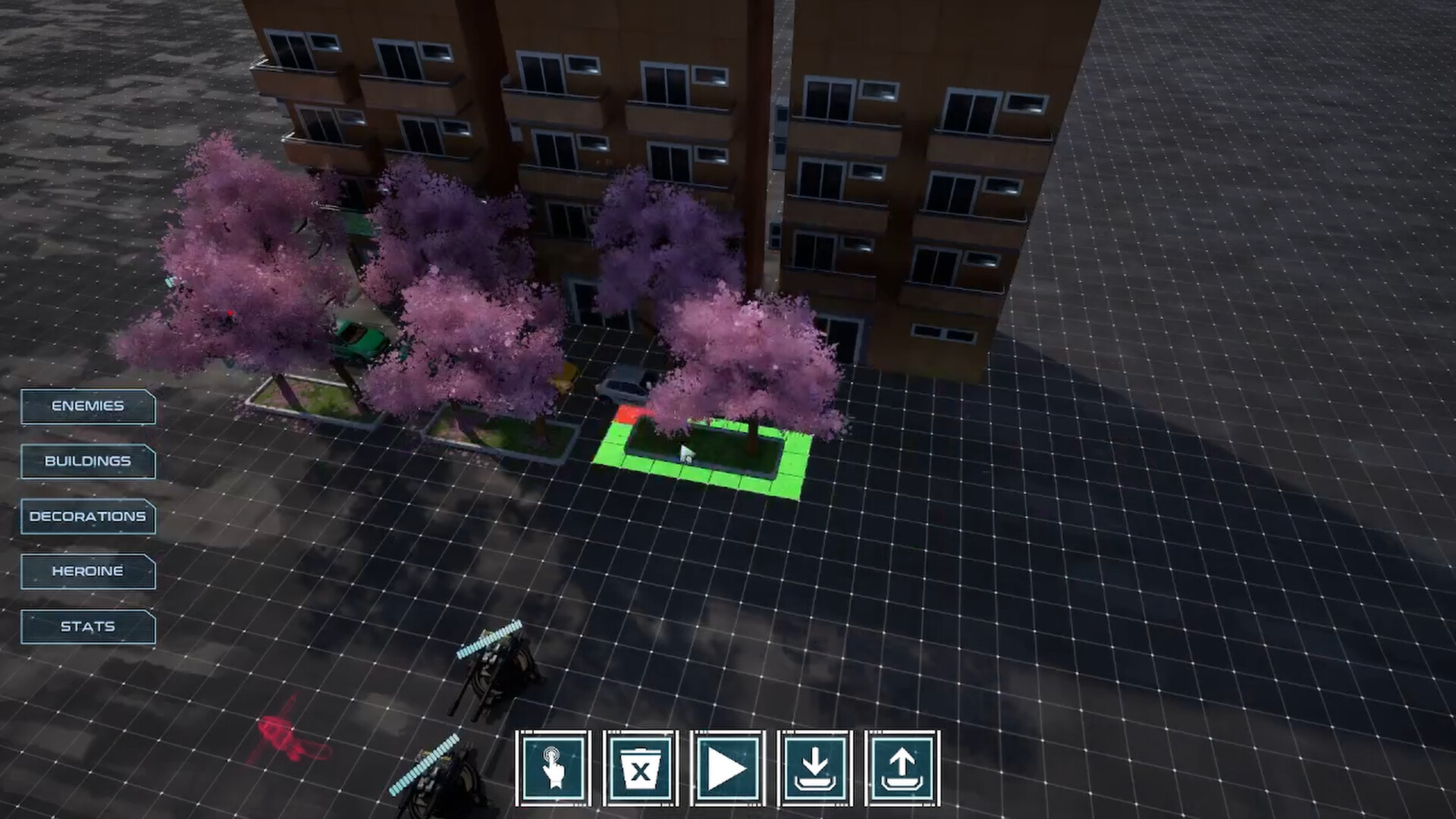 Custom level builder with various options to boost both enemies and the heroine.