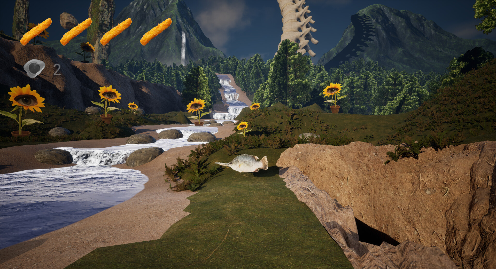 You play as a Fish named Fih, who gets both of its eyes stolen by an evil Hand, and you try and get them back. The game has interconnected areas, with heavy focus on exploration and finding hidden places/secrets (new weapons, weapon gimmicks, lore, extra health, etc) with fun movement and interesting combat.