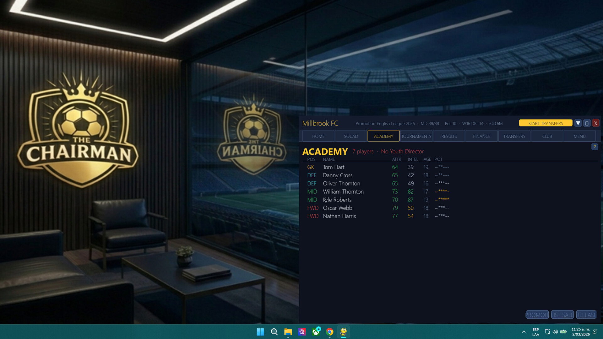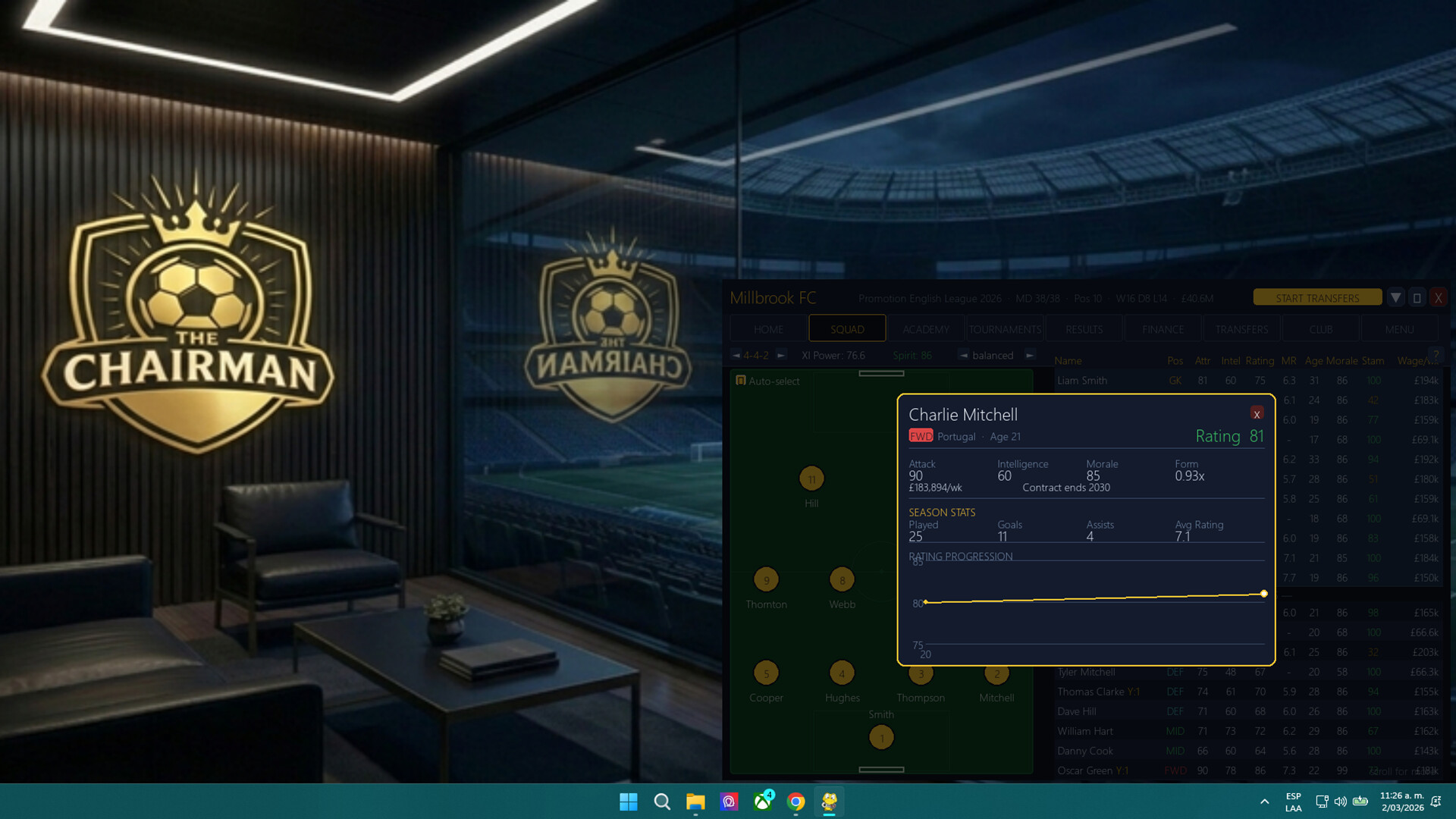 The Chairman is a football management sim built that lives in the bottom corner of your screen. Matches simulate automatically while you work, study, or do anything else. Check in when you have a moment. Make your decisions. Let the season run. You choose the time lap.