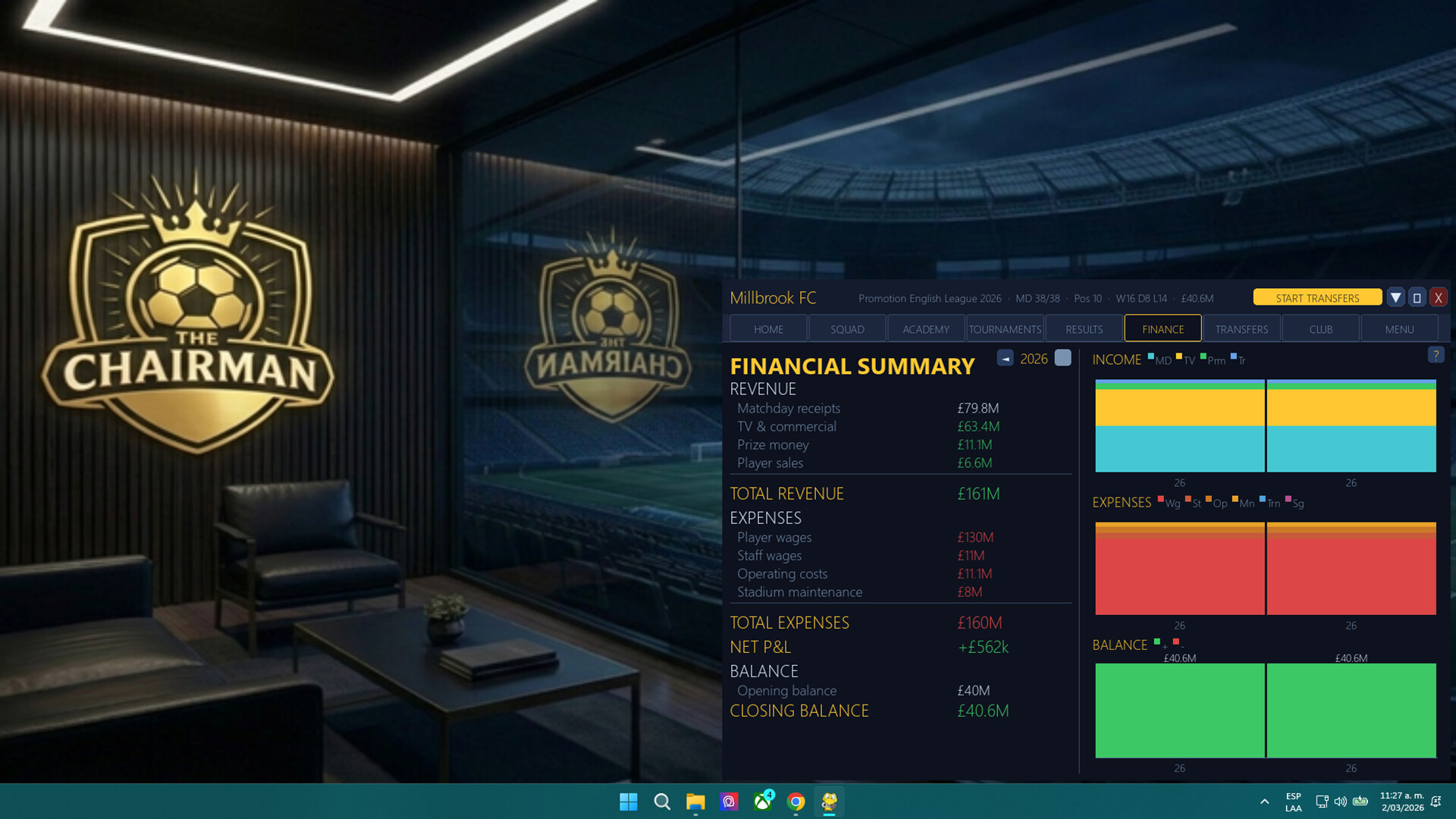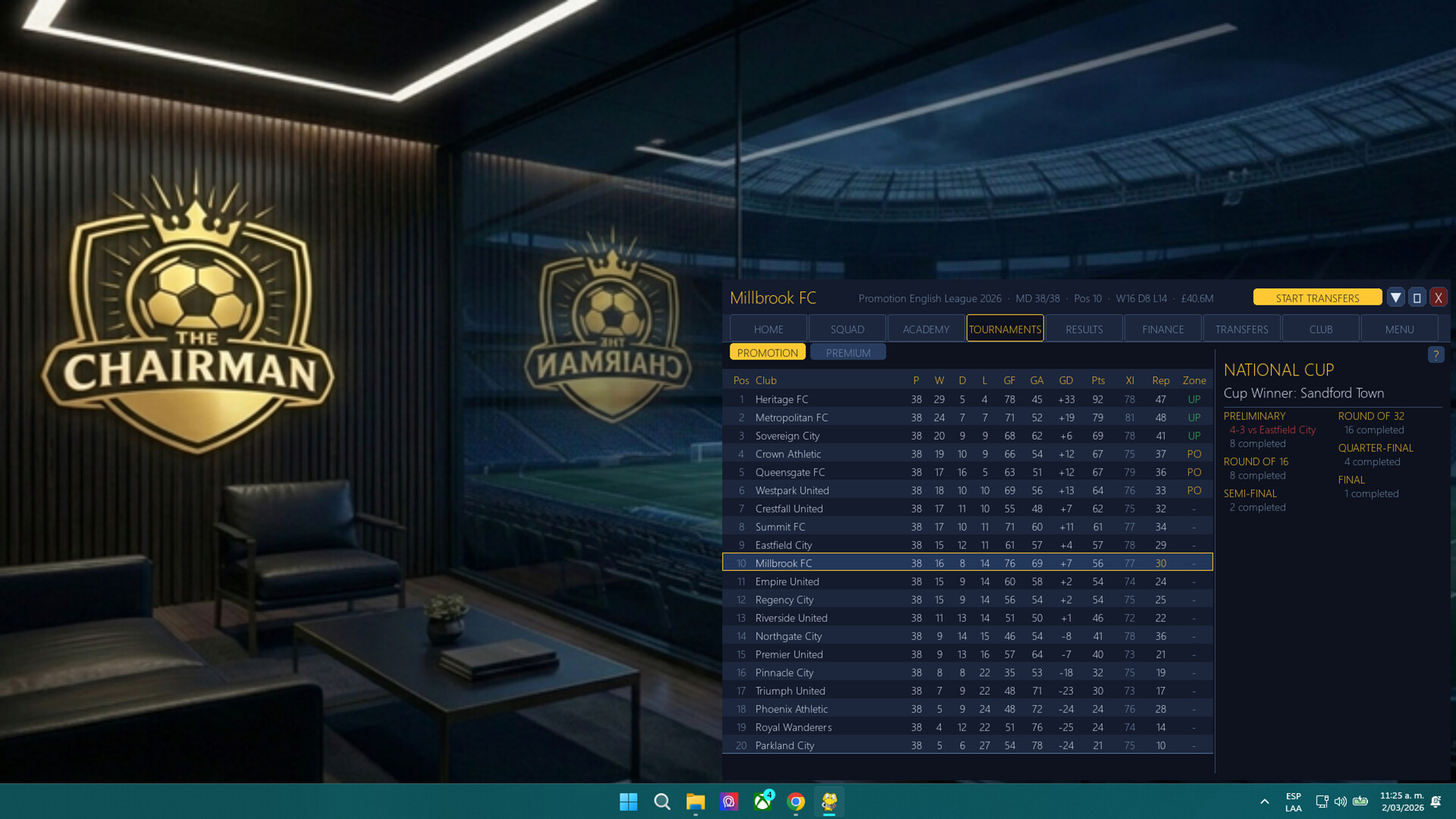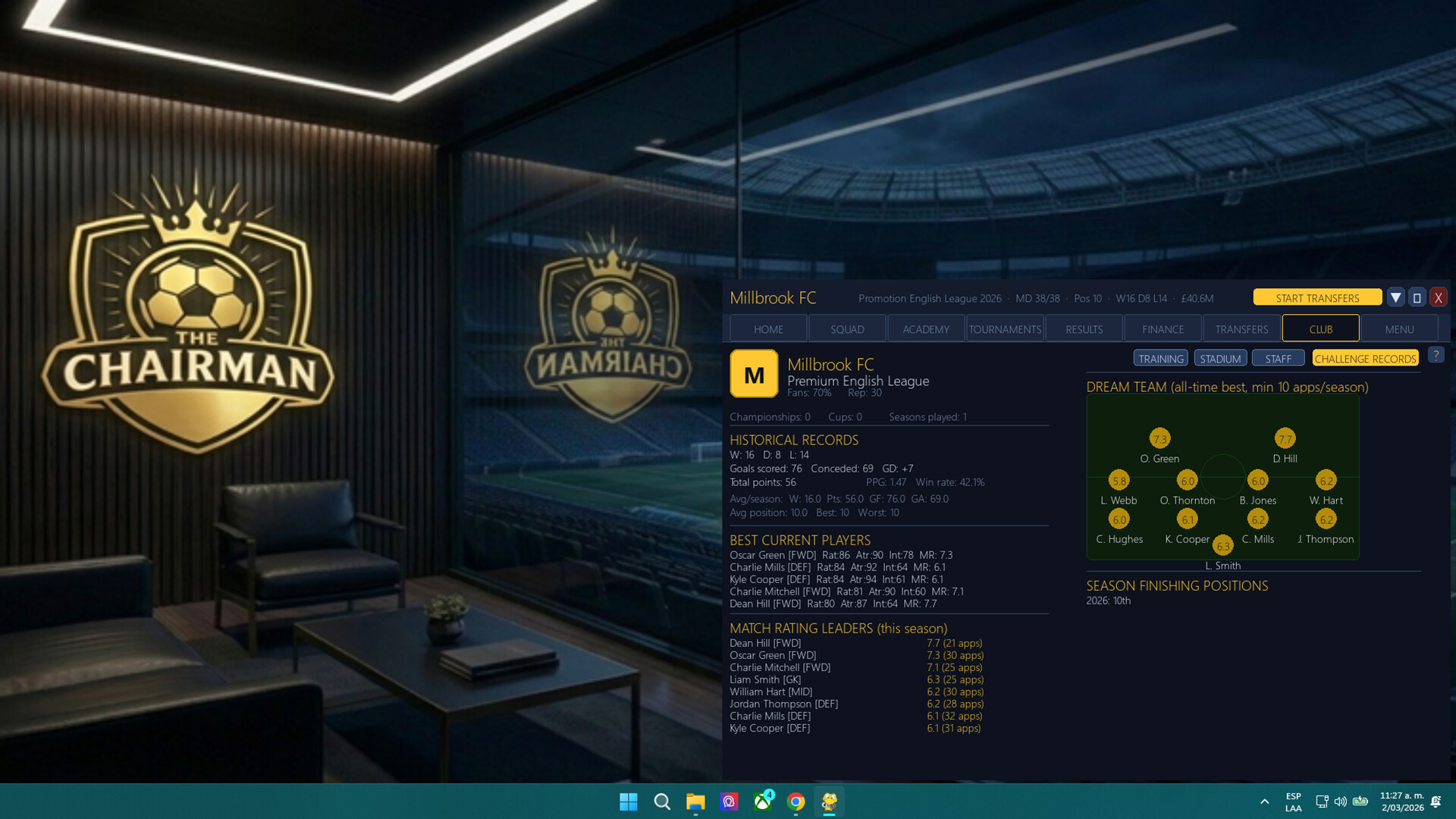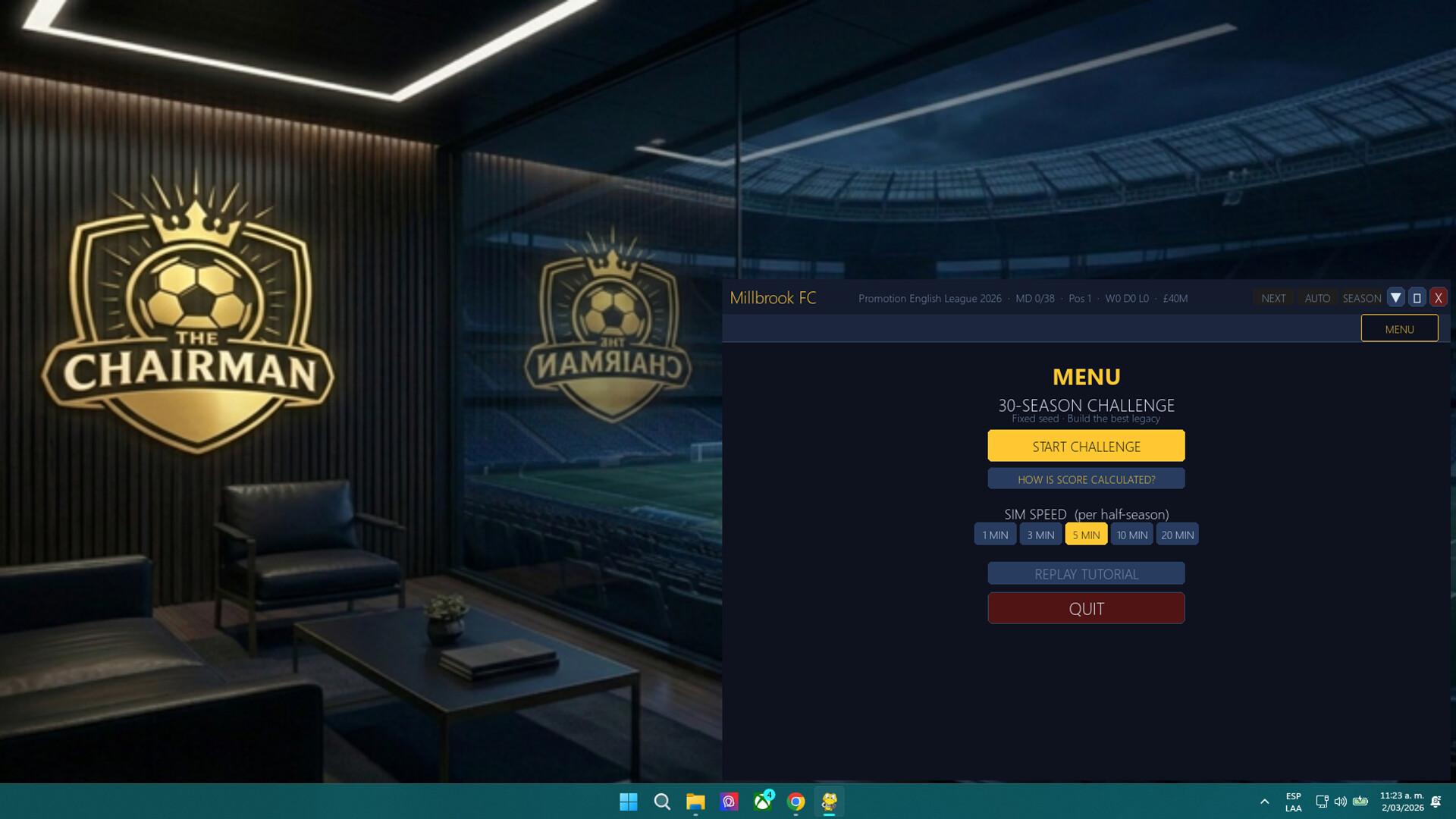 THE CHAIRMAN CHALLENGE Every player starts the same run. Same opponents. Same market. 30 seasons. One leaderboard. How far can you take your club?