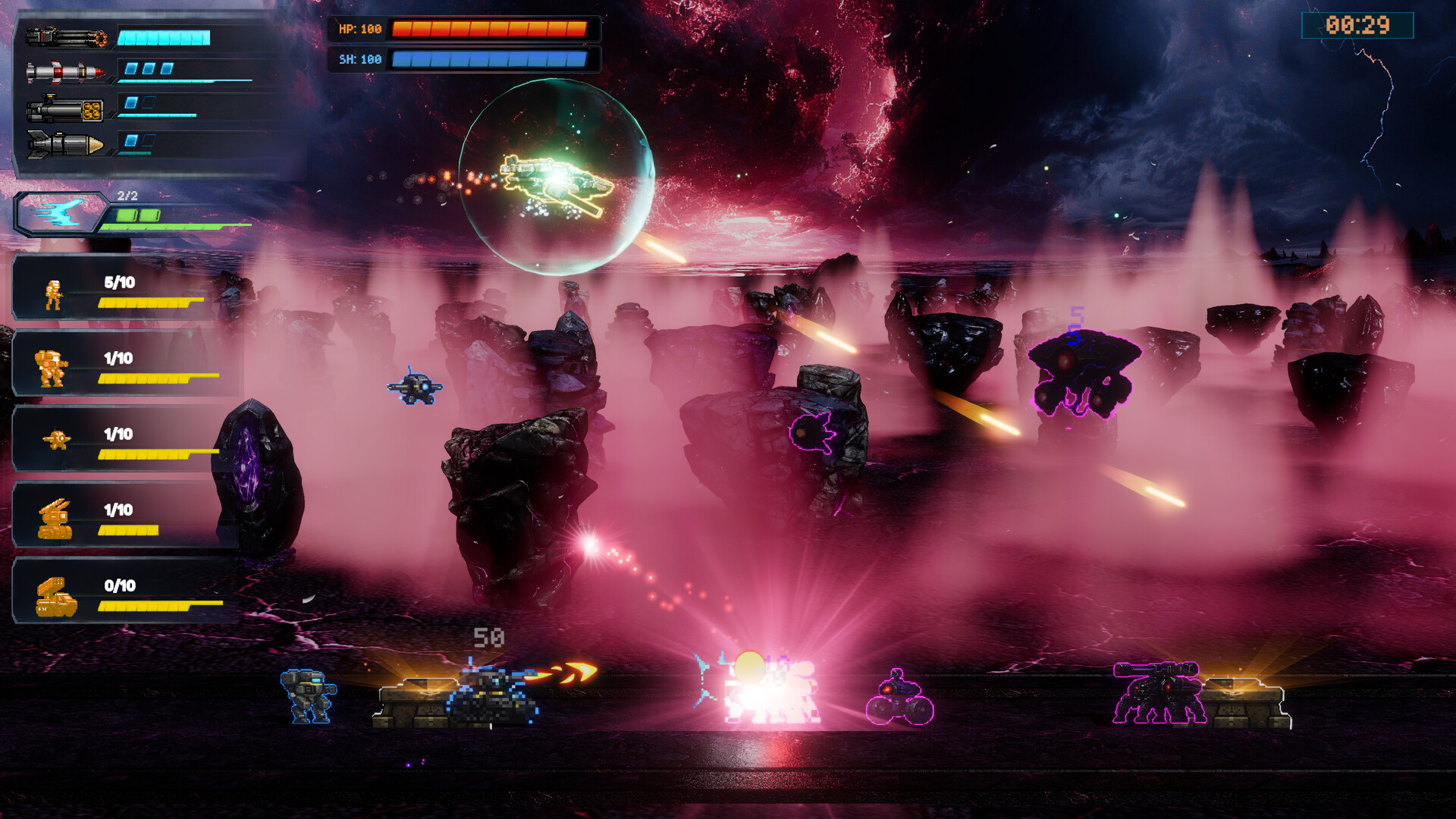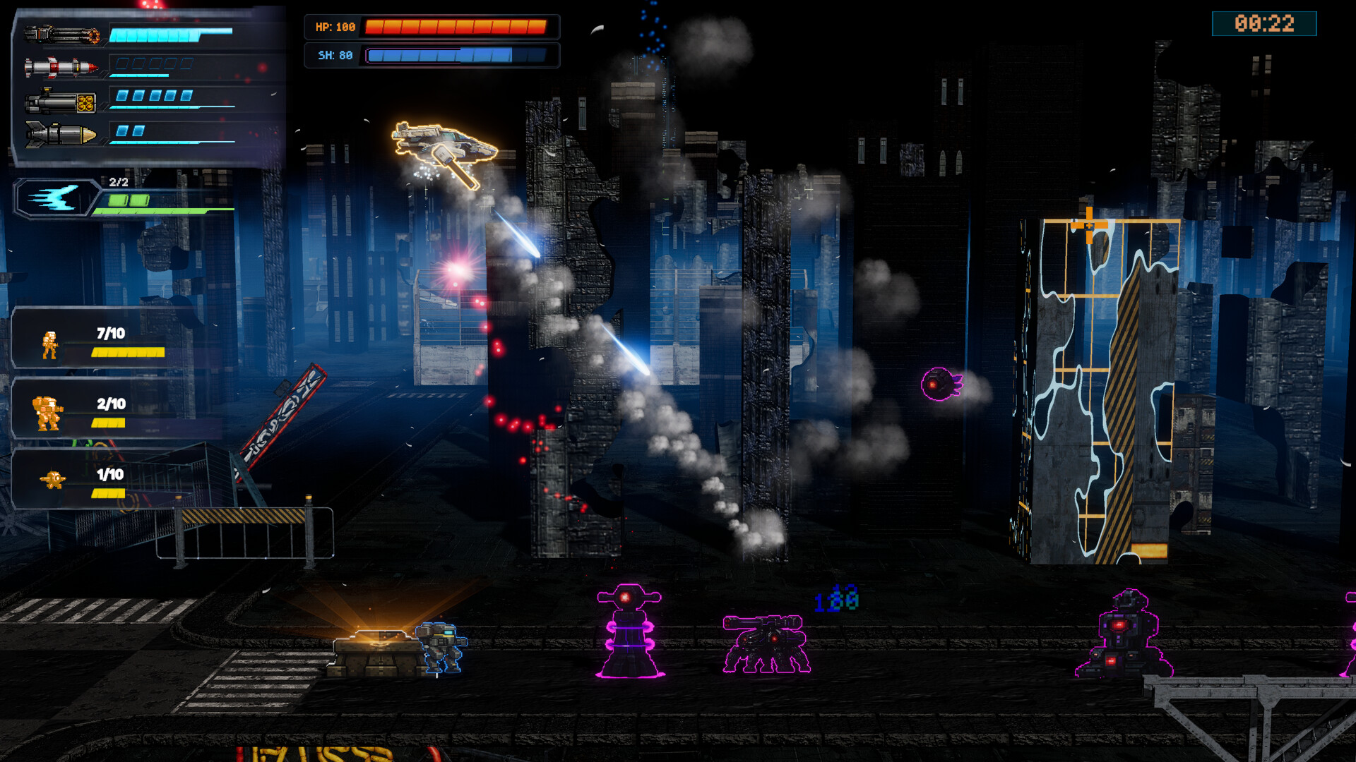 미사일, 폭탄, 기관포를 쏟아부으며 적을 파괴하는 동안 아군은 전선을 밀어붙입니다.