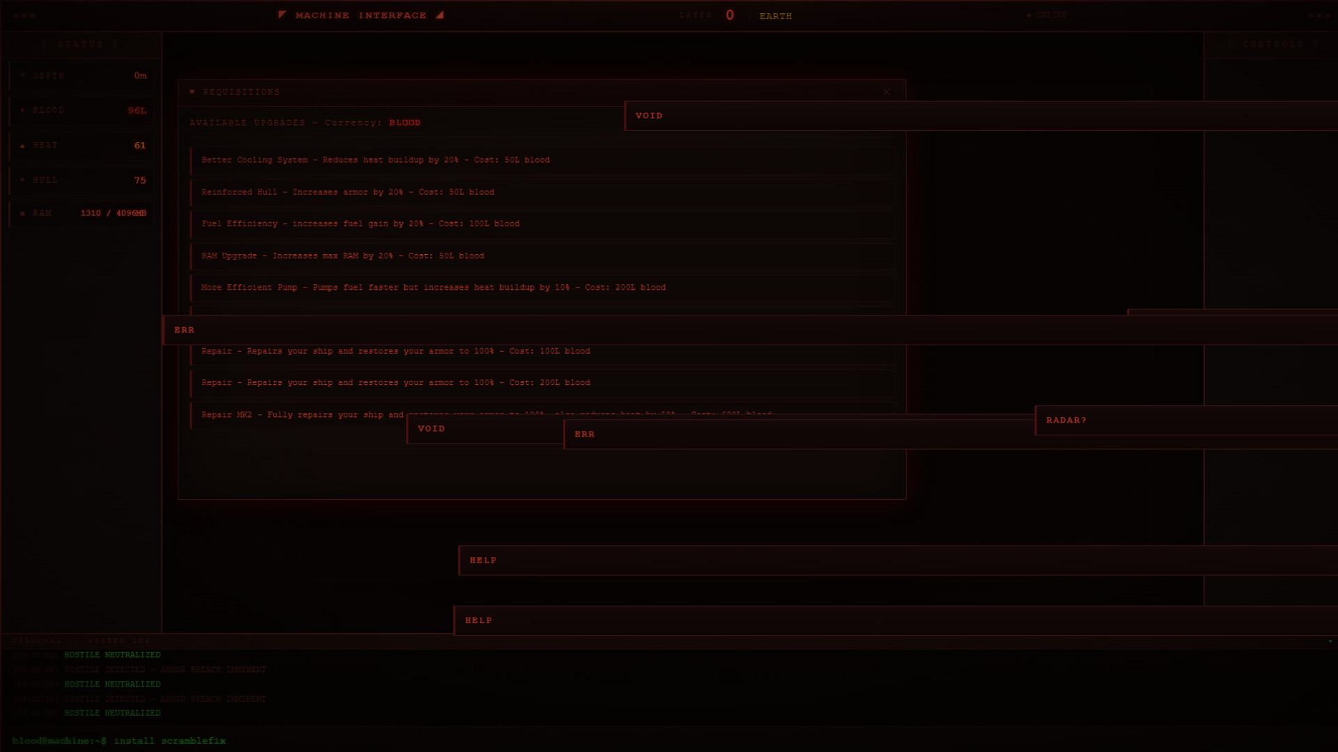 Micro-Manage Survival: Balance your blood (fuel), engine heat, and hull integrity. If you run out of blood, you fall into the abyss. If the engine overheats, you burn.