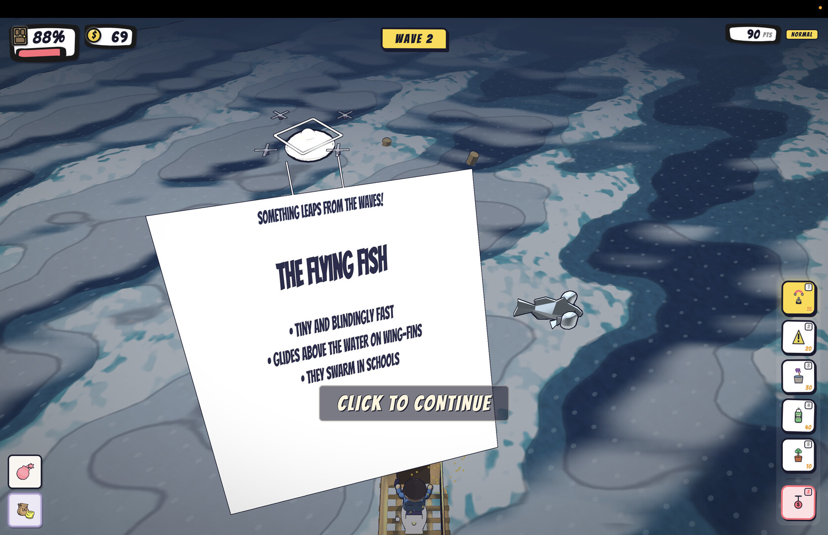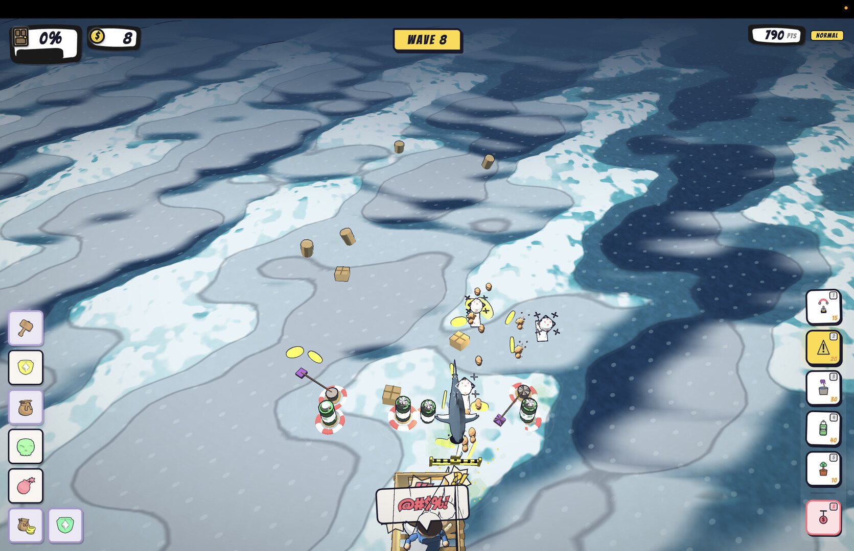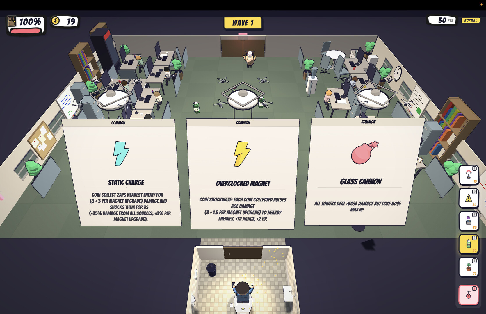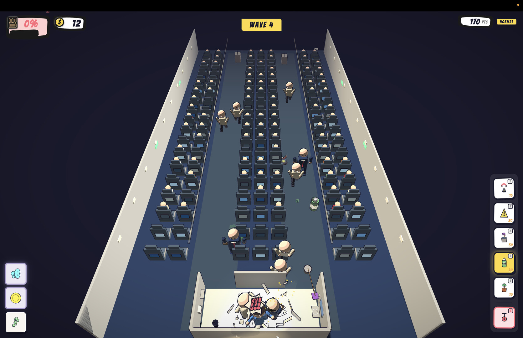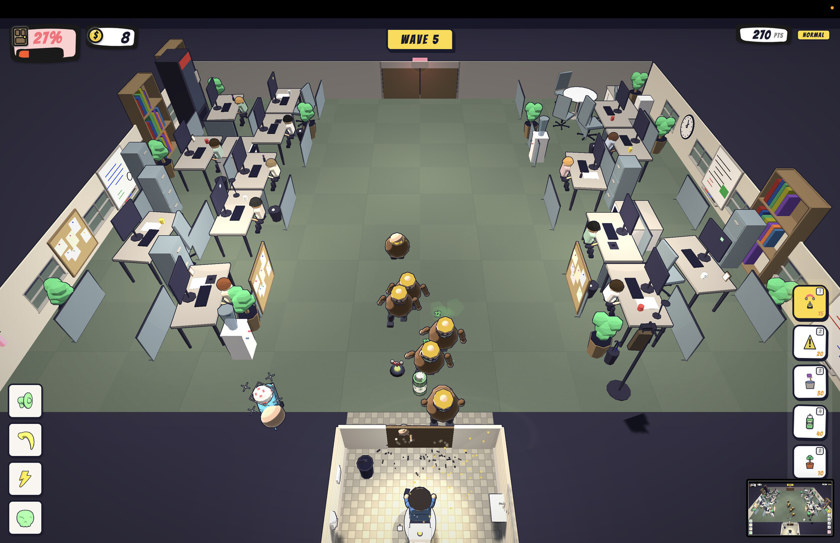 The campaign consists of four scenarios where you try to survive escalating waves of people who are busting to use the toilet and animals whose motivations are unclear. Gain money from knocking out enemies, then use it to buy drone deliveries of defense and utility items, such as Ubik spray cans, mops that automatically whack nearby enemies, wet floor signs that block movement, and more.