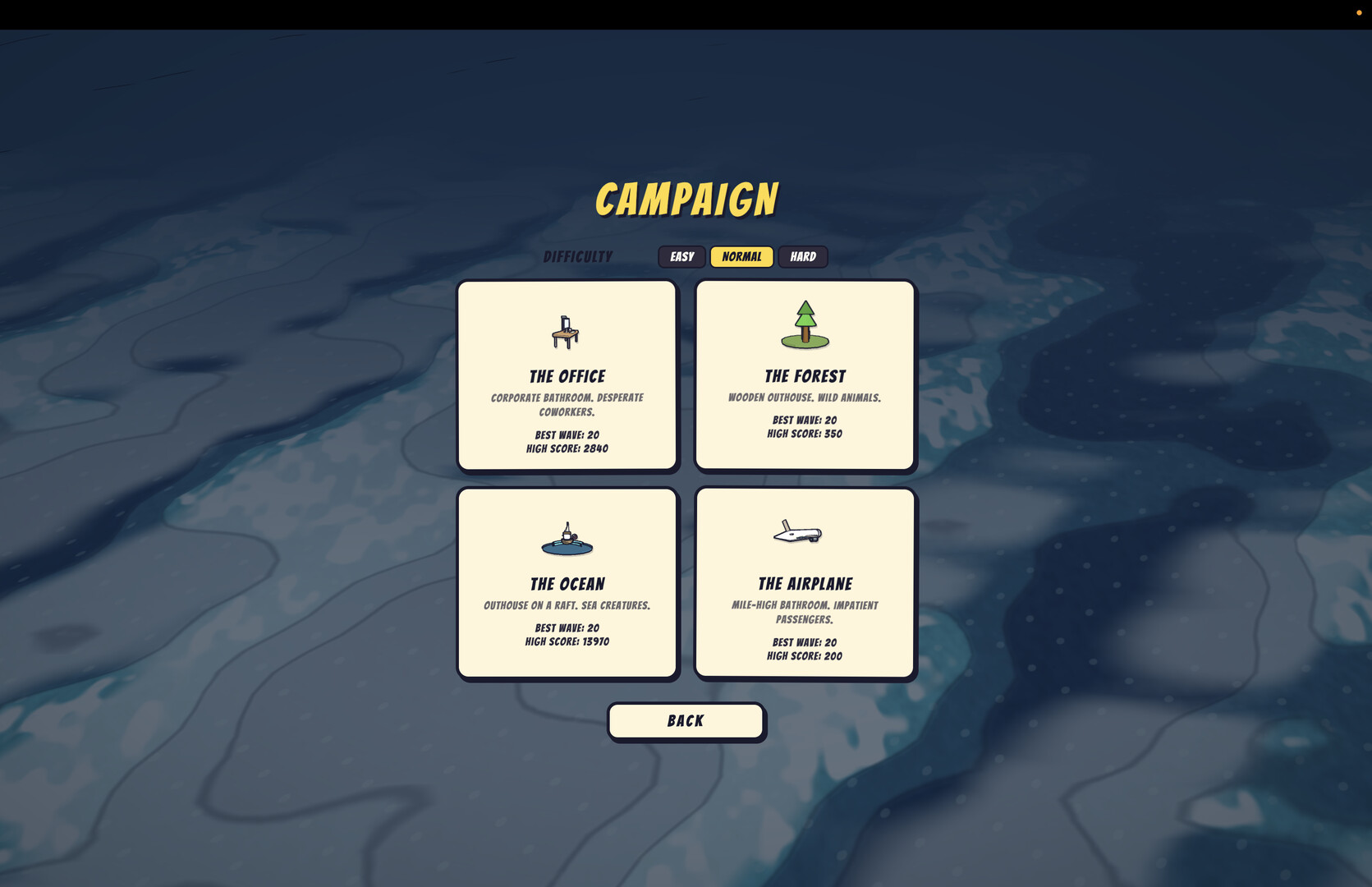 Each scenario in the campaign mode consists of 20 waves, with increasing danger and decreasing odds of survival. Once you've beaten the campaign mode for each scenario, you unlock Endless Mode, where your goal is to stay on the toilet as long as possible.