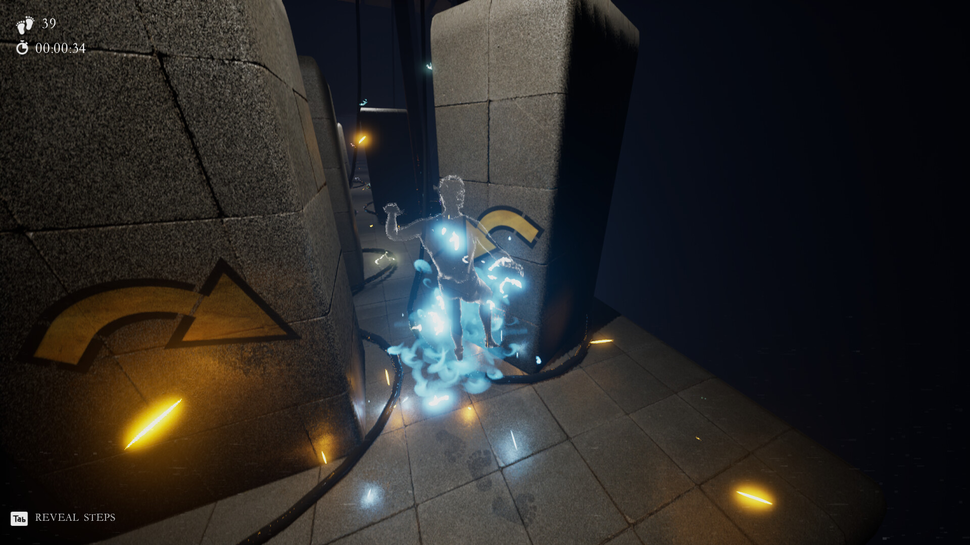 캐릭터는 완전히 보이지 않으며, 당신이 볼 수 있는 것은 움직이는 발자국뿐입니다. 그게 전부입니다. 몸도 없고, 도움도 없습니다. 오직 한 걸음씩, 그리고 당신이 어디에 있는지 추측하는 능력뿐입니다.