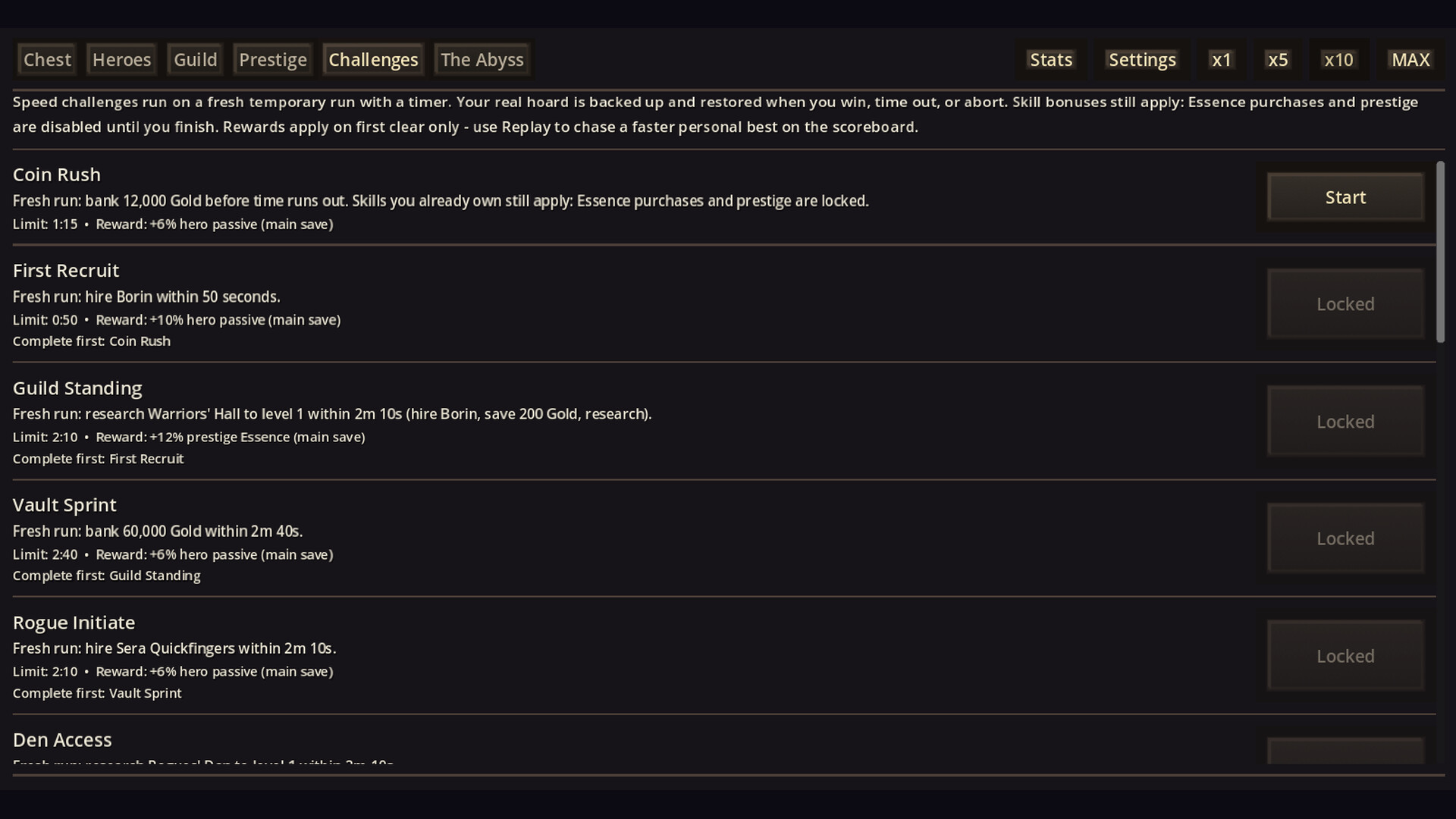 Tap the chest, buy upgrades, and grow a hoard that spirals into absurdity. Hire heroes, fund guild research, and spend Essence on a skill tree that persists between prestiges. When you need a change of pace, race the clock in speed challenges or descend into The Abyss