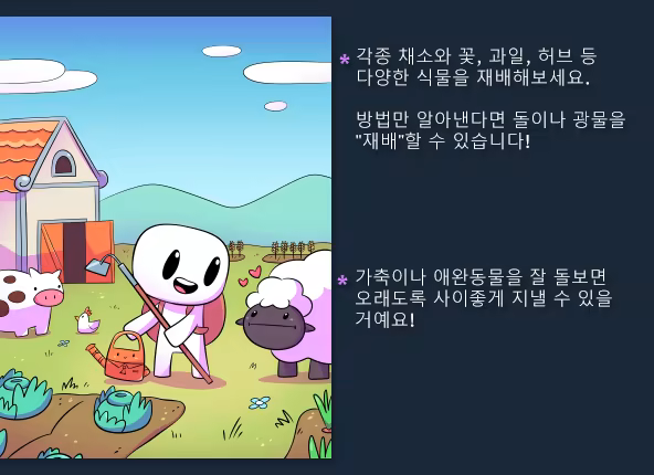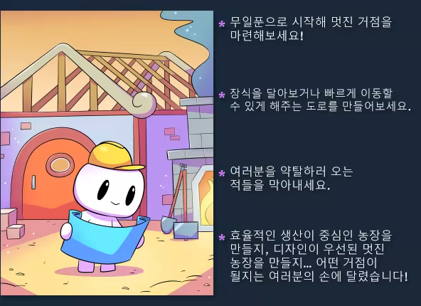 스듀랑 비슷하다고 하지만 그보다 아기자기한 공장류에 가까운 느낌 이런 게임 좋아하는 사람에겐 이만한 게임 없다고 생각함(내가 그럼) 밤 패널티가 없어서 하루하루 쫓기듯 플레이하지 않아도 되는 건 정말 마음에 든다