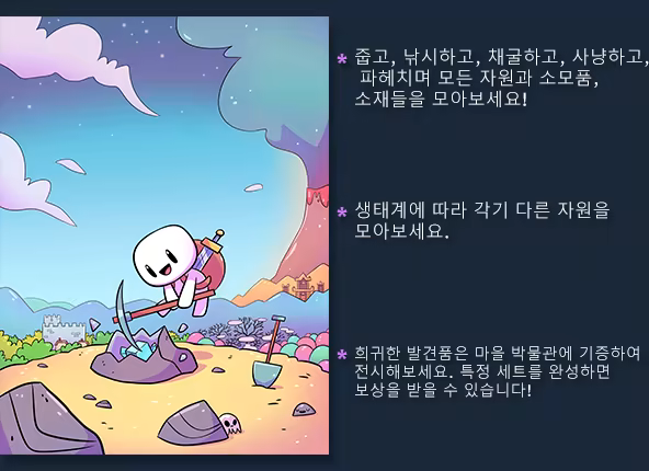Forager는 Stardew Valley나 Terraria, 젤다의 전설 시리즈와 같은 탐험, 농사, 제작 게임들에게 영향을 받은 2D 오픈월드 게임입니다.시작은 미약하지만 당신의 거점과 스킬, 장비, 인간관계(적과의 관계도요!)를 자신에게 맞는 스타일로 발전시켜가며 창대해질 여러분의 미래를 만들어나가세요!