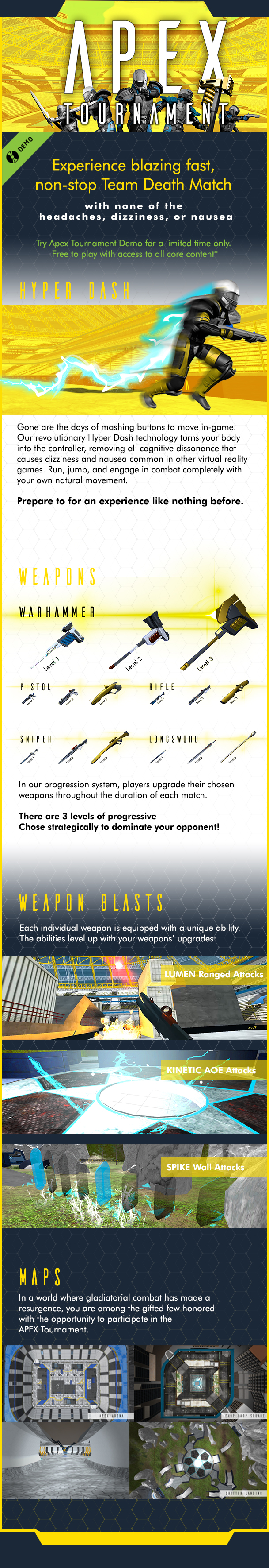 Apex Tournament is the most fast-paced Team Death Match in Virtual Reality. The primary method of movement is the Hyper Dash system, which turns your body into the controller - allowing movements at blazing speeds.