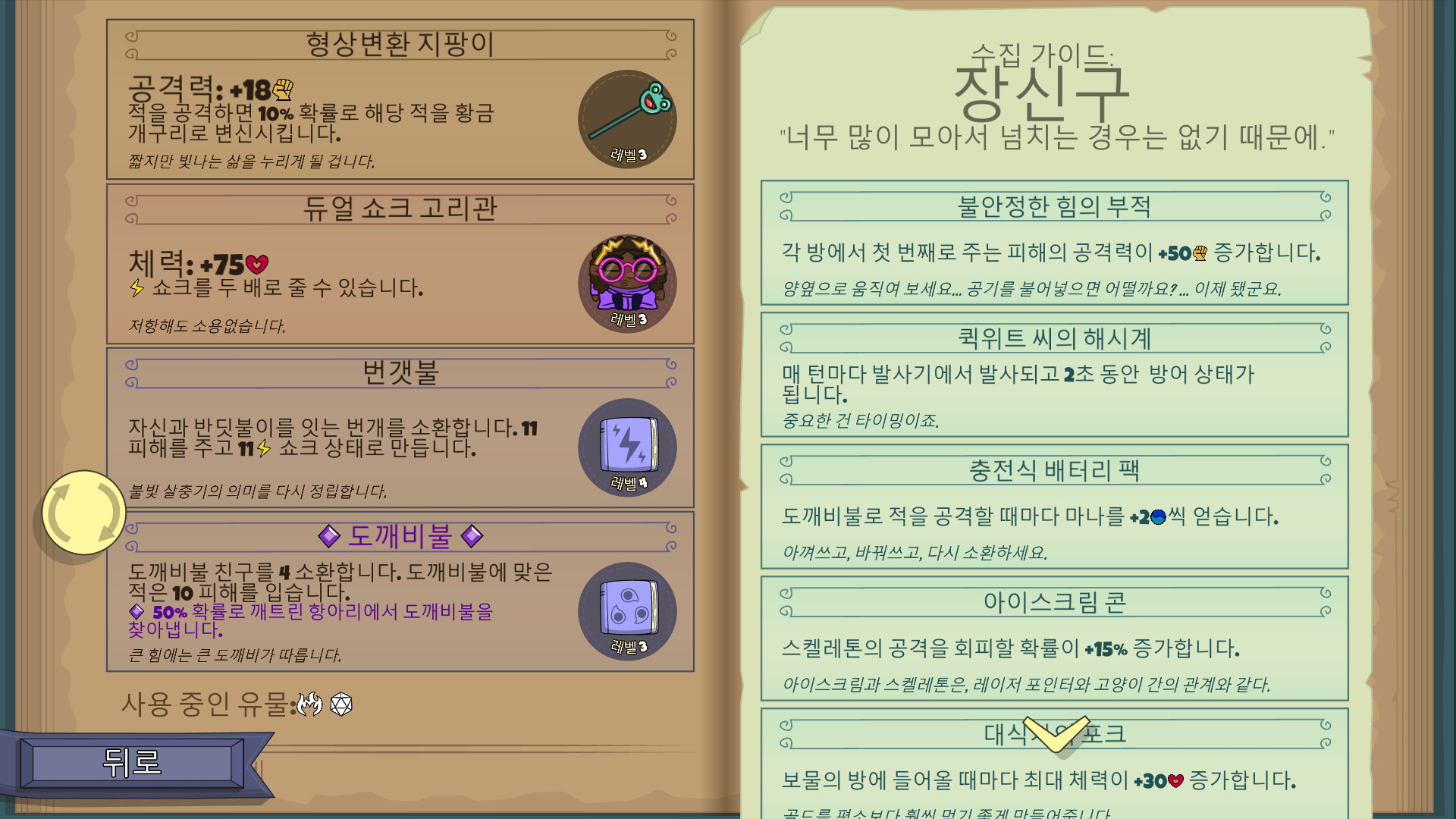 - 다양한 전리품: 100가지가 넘는 아이템과 장신구에는 모두 각각의 효과를 가지고 있기 때문에, 전략적으로 선택하고 콤보를 노리는 데에 사용할 수 있습니다.