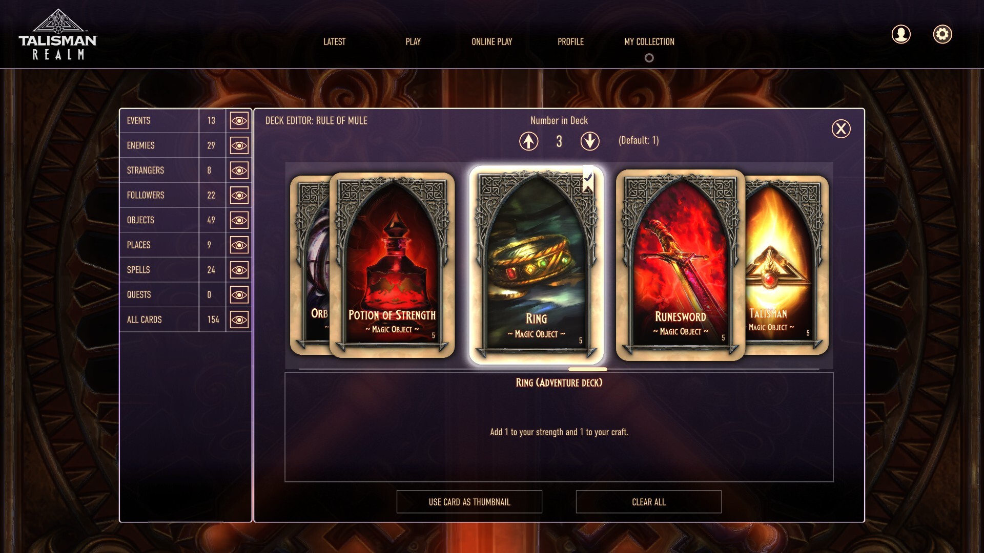 The biggest new feature in Talisman: Digital 5th Edition is the Deck Editor, which allows you to fully customise your Talisman experience by adding, removing and adjusting the cards you'll encounter during your game. Save your created decks, play them with your friends online and unleash your creativity with billions of possible combinations, and more being added with each expansion.