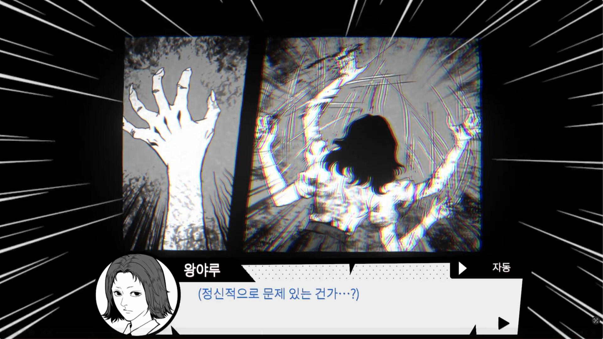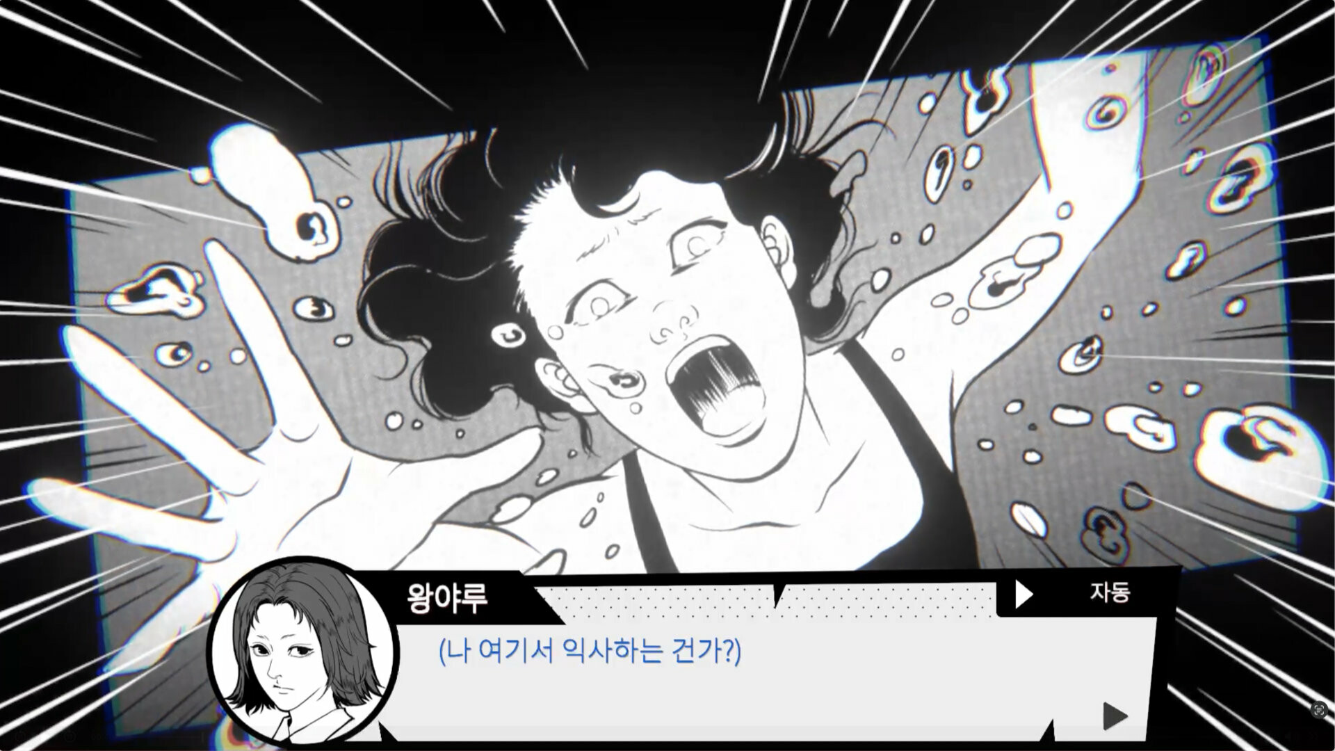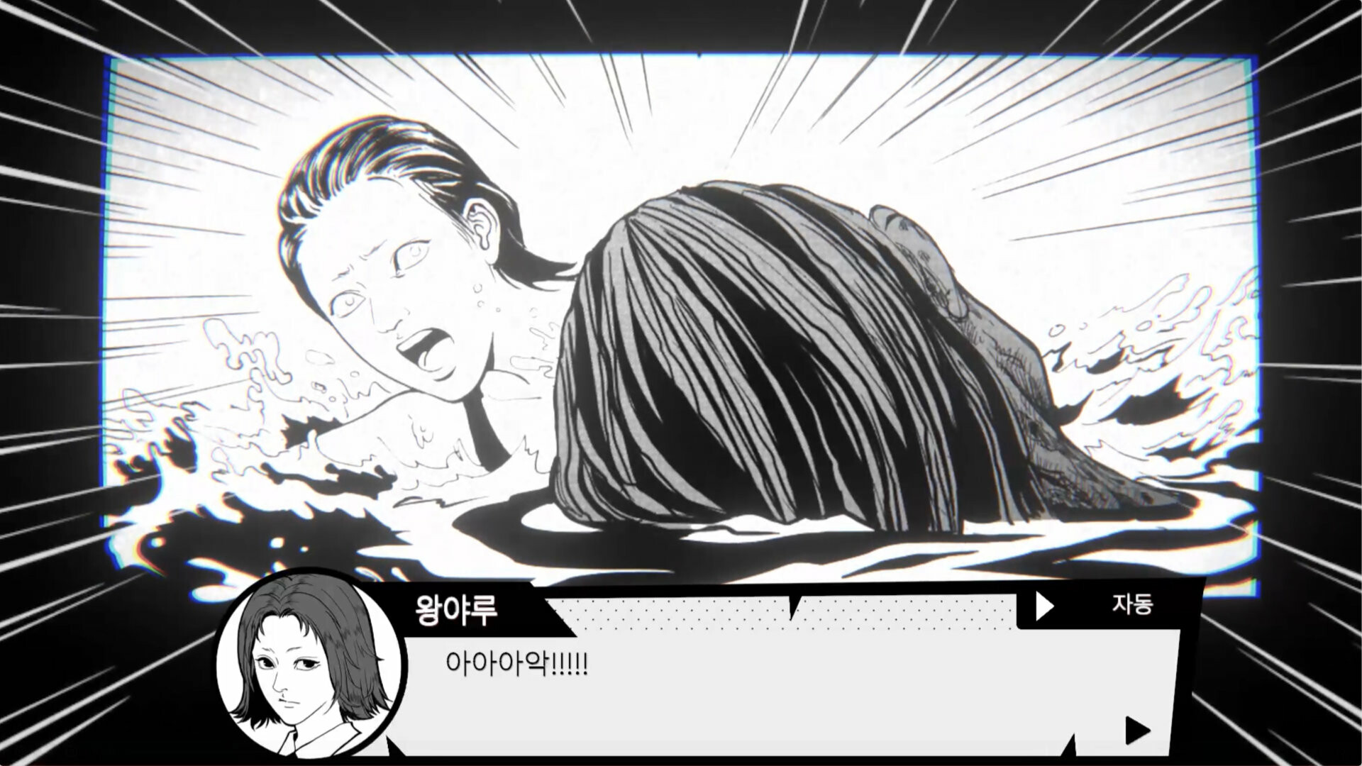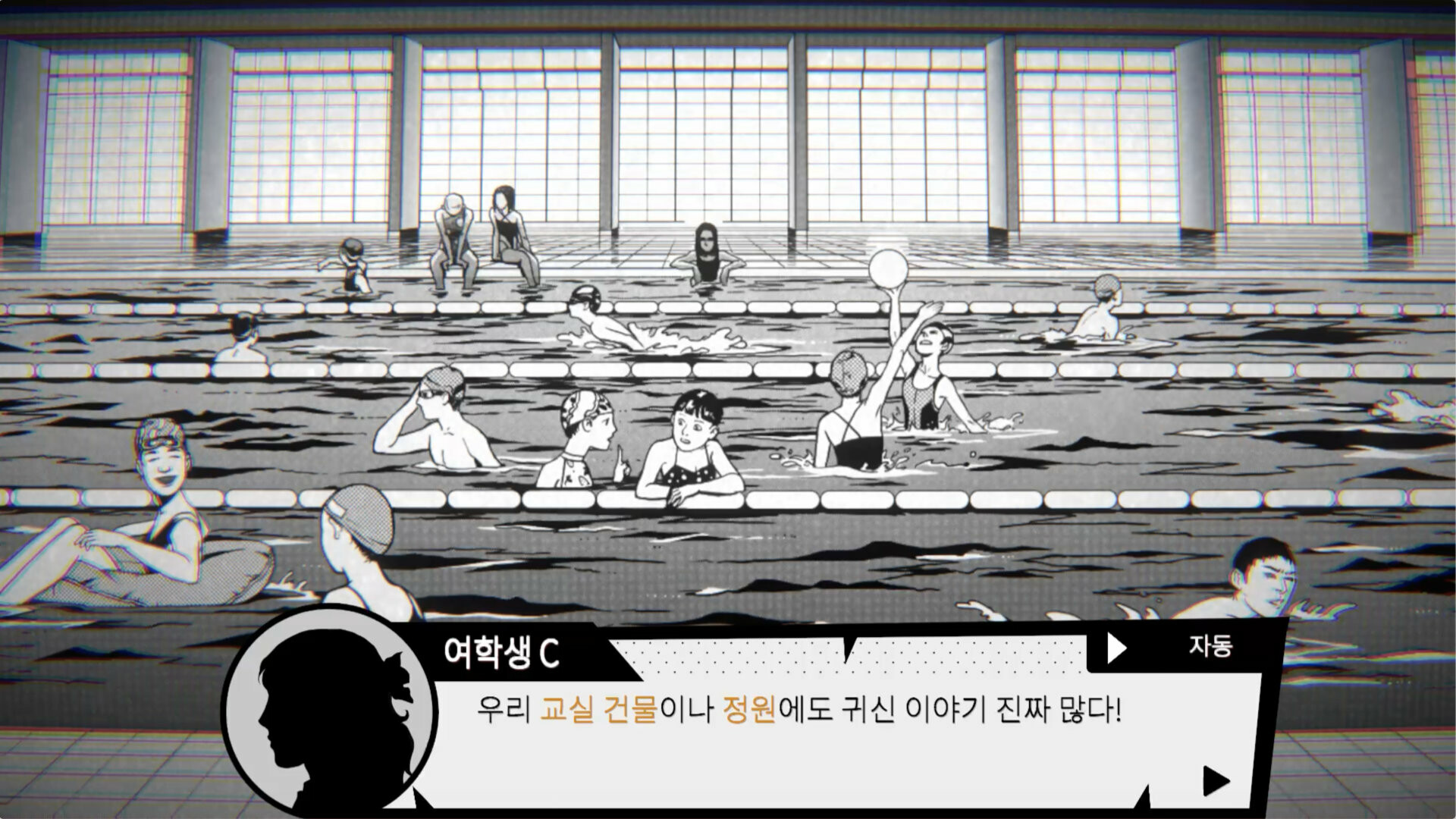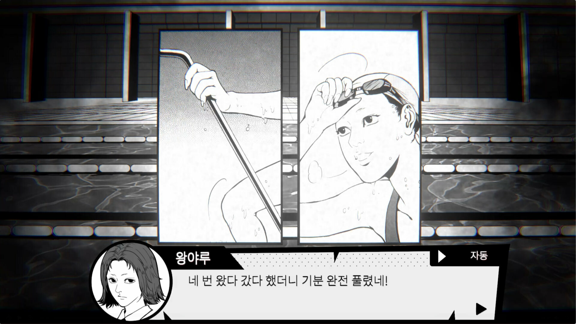 학교 수영장에 대한 괴담이 무성한 가운데, 수영에 대한 재능으로 학교에 명성을 날리는 주인공이 뒤떨어지지 않기 위해 저녁에 학교 수영장에서 수영 연습을 하는 이야기. Ghost in the Pool 은 게임의 제목대로 학교 수영장에 저녁이 되면 귀신이 나온다는 괴담이 떠도는 한 명문 고등학교에서, 이 게임의 주인공 “야루” 가 학교 내 라이벌에게 뒤쳐지지 않기 위해 저녁에 몰래 학교 수영장에 잠입해서 추가 연습을 하려는 계획을 세우는 상황에서 시작하는 게임이다. 게임의 진행은 매우 단순한데, 공간 내 오브젝트들을 클릭해 상호작용하며 주인공이 짧게 이에 대한 만담을 하는 걸 듣는 구간과, 게임이 비주얼 노벨처럼 진행되면서 텍스트가 나오고 선택지를 고르는 구간, 이 두 부분이 합쳐져서 하나의 텍스트 기반 게임플레이를 이루고 있다. 이 때문에, 이 게임의 설명란처럼 단편 공포 비주얼 노벨을 플레이한다는 생각으로 맛을 보는 게 좋다. 이 게임에서 제일 마음에 드는 건 비주얼이었는데, 무언가 전형적인 흑백 일본 만화에 나올 법 듯한 그림체를 채용하면서도, 전체적으로 깔끔한 인물 및 오브젝트의 표현과, 흑백이라 배경이 칙칙해질 수 있음에도 심심하지 않은 배경 표현으로 인해 시각적으로는 전체적으로 만족스러웠다. 하지만, 이 게임의 문제점은 비주얼이 아닌 다른 부분들에서 찾을 수 있었다. 1. 스토리가 조금 부실한 편인데, 하나의 괴담을 쭉 이끌고 가는 내용이라 기승전결이 뚜렷하기는 하지만, 공포보다는 병맛에 가깝다. 스팀 페이지만 보면 도대체 이게 왜 병맛 게임인지 알 수 없을 것이지만, 이 게임의 굿 엔딩을 본다면 “ㅋㅋㅋㅋ 진짜 개그 엔딩이네 ㅋㅋㅋ” 라는 걸 직격으로 느낄 수 있을 것이다. 물론, 이 게임이 멀티 엔딩 시스템이니까 “굿 엔딩만 병맛이고 다른 건 정상적인 공포 게임처럼 뽑지 않았냐?” 라는 질문을 할 수 있다. 다른 엔딩들은 그나마 공포 게임에 걸맞은 엔딩들이긴 하지만 ……. 애초에 게임의 분량이 30분 정도로 길지 않은 상황에서 – 그 마저도 30분 중 절반은 위에서 말한 오브젝트 상호작용을 일일이 읽느라 시간을 다 소비한 것이지 – 이 게임에서 실제로 스토리 진행에 중요한 선택 및 사건들은 굉장히 적고, 이 때문에 스토리에 별 영양가가 없이 느껴져서, 다른 엔딩들을 둘러보는 재미도 없었다. 여기에 더해, 상호작용들은 스토리에 전혀 관여하지 않고 그저 게임의 분위기를 살려주거나 잡담을 게임에 넣는 용도로만 쓰이기 때문에, 스토리의 부실함을 더 강조하는 역효과만 불러 일으켰다. 2. 그나마 뭐라도 해 보려고 했던 스토리보다 더 부정적인 감정을 느낀 점은, 바로 느려 빠진 텍스트 속도이다. 요즘 비주얼 노벨들에 읽었던 텍스트 스킵 기능 / 마우스 클릭 한 번에 한 대화창에 해당하는 모든 텍스트가 한 번에 뜨는 기능 등등이 필수로 들어가는 가운데, 이 게임은 그런 것 없이 하나하나 텍스트가 화면에 뜨는 걸 보고 마우스 클릭을 눌러서 다음으로 넘어가야 한다. 그나마 설정에서 텍스트 속도를 빠름으로 하면 클릭을 하지 않아도 텍스트가 바로 뜰 정도로 텍스트 속도 자체는 꽤 신속하기는 하지만, 만약 다회차를 한다 하더라도 이미 읽은 텍스트를 건너뛸 수도 없이 화면에 이미 본 텍스트가 뜨는 걸 보고 클릭을 하는 과정에서 인내심이 죽어가는 걸 느낄 수 있을 것이다. 여기에 더해, 위에서 말한 오브젝트 상호작용을 누르면, 클릭한 물체로 느리게 화면이 확대되는 걸 보고 > 또 느릿느릿한 텍스트를 일일이 클릭해 가며 읽다가 > 또 느리게 화면이 축소되는 걸 보고 있어야 한다. 게임의 내용이 풍부하거나, 충분히 음미할 만한 자잘한 자료들이 많았다면 이게 큰 단점으로 느껴지지 않았을 것이다. 그런데 맛을 볼 알맹이도 지우개 가루만 한 데다가, 그렇게 쥐뿔도 없는 내용을 느릿느릿하게 보여주고 있으니, 이 게임을 하면서 답답함을 한 번도 안 느낀 플레이어라면 아마도 내면의 평화를 진작에 찾은 사람이라고 생각한다. 결론적으로, 비주얼은 괜찮았으나, 게임의 스토리 및 편의성 기능은 영 별로라 그렇게 추천하고 싶지는 않은 게임. 이걸 정가로 사는 미친 짓은 절대 하지 말고, 공포 비주얼 노벨을 즐기고 싶다면 차라리 요즘 나오는 무료 아니면 1100원 짜리 텍스트 기반 / 비주얼 노벨 게임들 중 이것보다 더 몰입되는 게임들이 많으니 다른 게임들을 사는 걸 추천한다. 여담) 업적들은 모든 엔딩 보기 및 특정 선택지 조합에서 나오는 악몽들을 보는 거라 그렇게 어렵지는 않다. 원하는 선택지 분기로 돌아갈 수 있기 때문에 세이브 / 로드에 너무 집착할 필요는 없었다. 또한, 이 게임은 게임이 꺼진 이후에 스팀 업적 달성 창이 주르륵 뜨는 게임이기 때문에, 업적 달성이 안 된다고 너무 걱정하지는 말자.