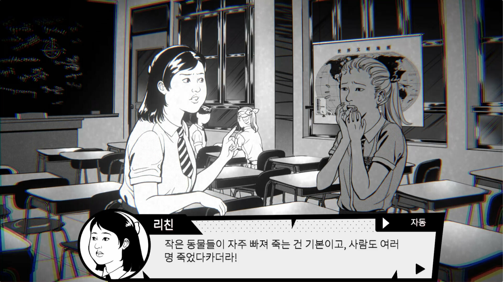 공포인척하는 개그 게임 고어물 못 보는 사람에게는 비추 대사 나오는 속도가 너무 느리면 오른쪽 위 설정에 좀 더 빠르게 대사 나오게 할 수 있습니다. **도전과제** 도전과제 night mare 03 얻는 법 1일째 교실 밖 복도에서 복도 끝 여자애 무시 1일째 야간 교정에서 샤워 선택 집에 가서 두고 온 숙제 가지러 학교 가기 선택 집으로 돌아와서 잠들면 악몽꾸면서 도전과제 완료됩니다.