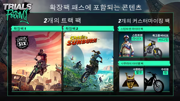 Trials® Rising의 확장팩 패스를 구매하고 여러분을 기다리는 55개 이상의 트랙을 통해 훨씬 더 많은 세계를 누벼보세요!