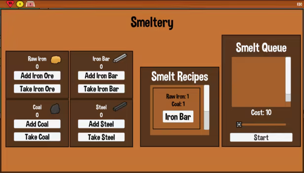 Alternatively, you can take Mike's iron and coal over to the local Smeltery. With a couple of coins and a little time, Mike can turn that useless iron ore into iron bars. Furthermore, those iron bars can be turned into steel bars. Technology has really gone beyond comprehension.