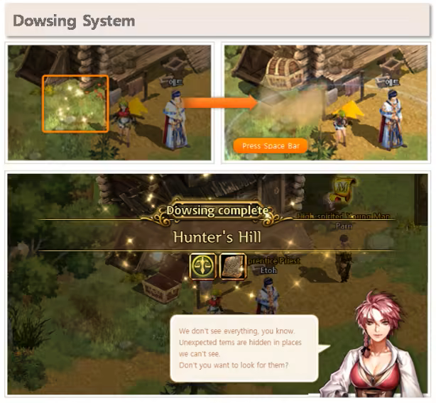 Dowsing feature allows players to find rewards when activated in specific areas. One can acquire items necessary for the game or quests. Dowsing is activated by pressing the 'Space Bar' in hunting grounds. If a reward is hidden within the area, a treasure chest pops up for the players to claim.