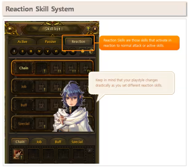 There are 2 types of Reaction Skills available for players. "Chain Reaction", and "Job Reaction". These skills are activated automatically when certain conditions are met. As players level up, they unlock higher tier reaction skills, which allows them to establish their own combat style according to the choice of reactions skills as their character advances.