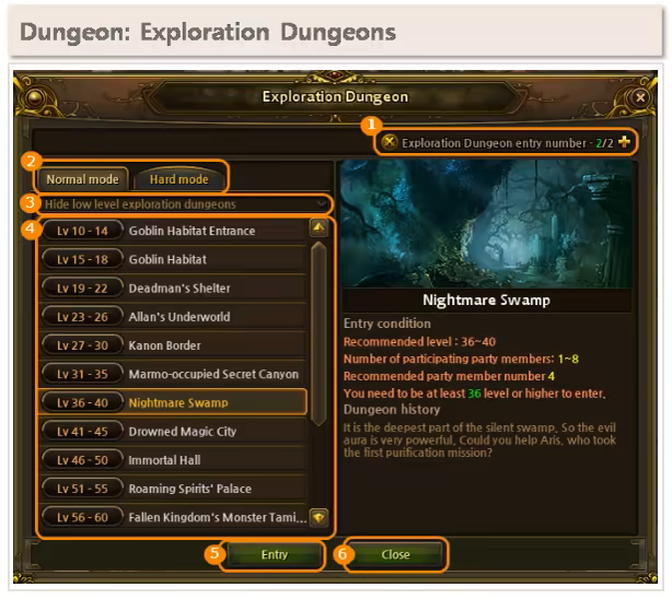 5. Entry : You can enter the dungeon by click this button after fulfilling all conditions for entry.