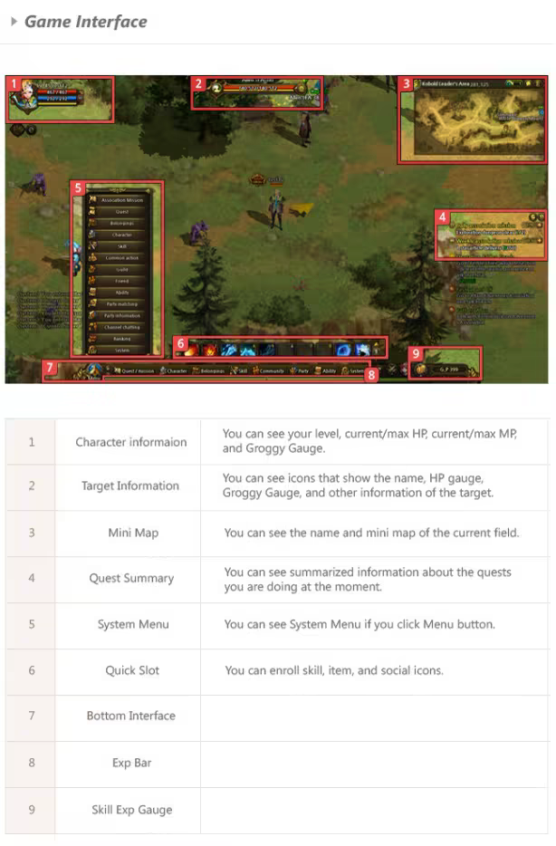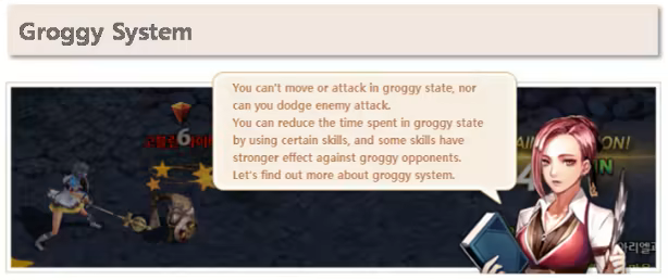 Groggy state occurs when the Fierce guage (Yellow bar) drops to 0 after being attacked by normal attacks or skills. Both players and monsters can become groggy. Some skills cause serious damage, or have reduced cooldown against groggy targets, having a great effect against them.