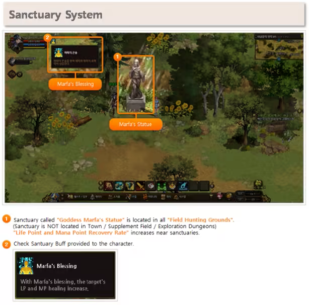 Life Point and Mana Point recover faster in sanctuaries, where the stone statue of Goddess Marfa stands. Sanctuary serves as a resting place for players in hunting grounds. Also, when players die in hunting grounds with sanctuaries, they can revive near the statue.