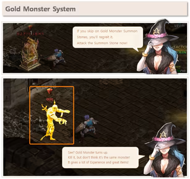 A golden tombstone for summoning Gold Monsters sometimes appear after a monster is eliminated. If the player destroys the tombstone, the monster comes out again as a Gold Monster. Players receive a great amount of EXP for eliminating Gold Monsters. The golden tombstone and the Gold Monster disappears after a certain period of time.