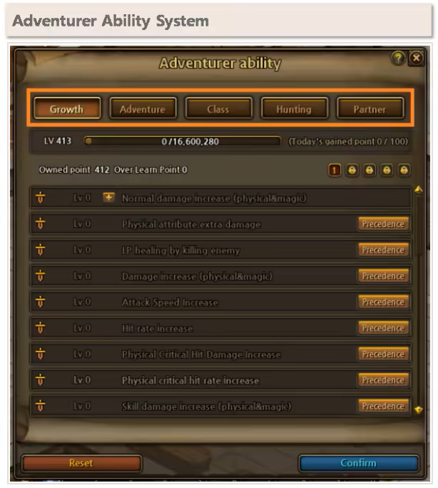 Adventurer Ability allows players to plan how they want to develop their character. There are 5 abilities. Growth and Class abilities help players in combat. Adventure abilities help exploring the world of Lodoss. Hunting abilities, only obtainable from Labyrinths, helps against a specifit type of monsters. Partner abilities can be obtained by completing NPC Trust quests.