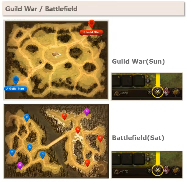 Guild War takes place on Sundays. Guild Masters need to apply within a preset time period, then attending guilds battle out for Honor Scores, with top ranking guilds registered in Hall of Fame.