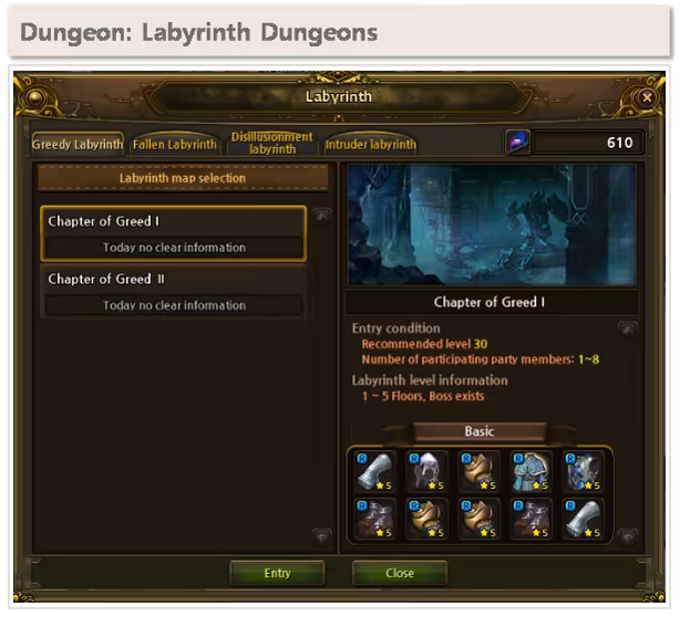 Labyrinth Dungeons are for players higher than level 30. After entering, players clear one chapter after another, moving up to next floor. Each Labyrinths are made of different number of floors to be cleared. After clearing Labyrinth Dungeon, players can gain "Labyrinth Random Box", which contains Labyrinth EX items. These items have Labyrinth Options that enhances skill effect greatly, allowing further customization of player combat style.
