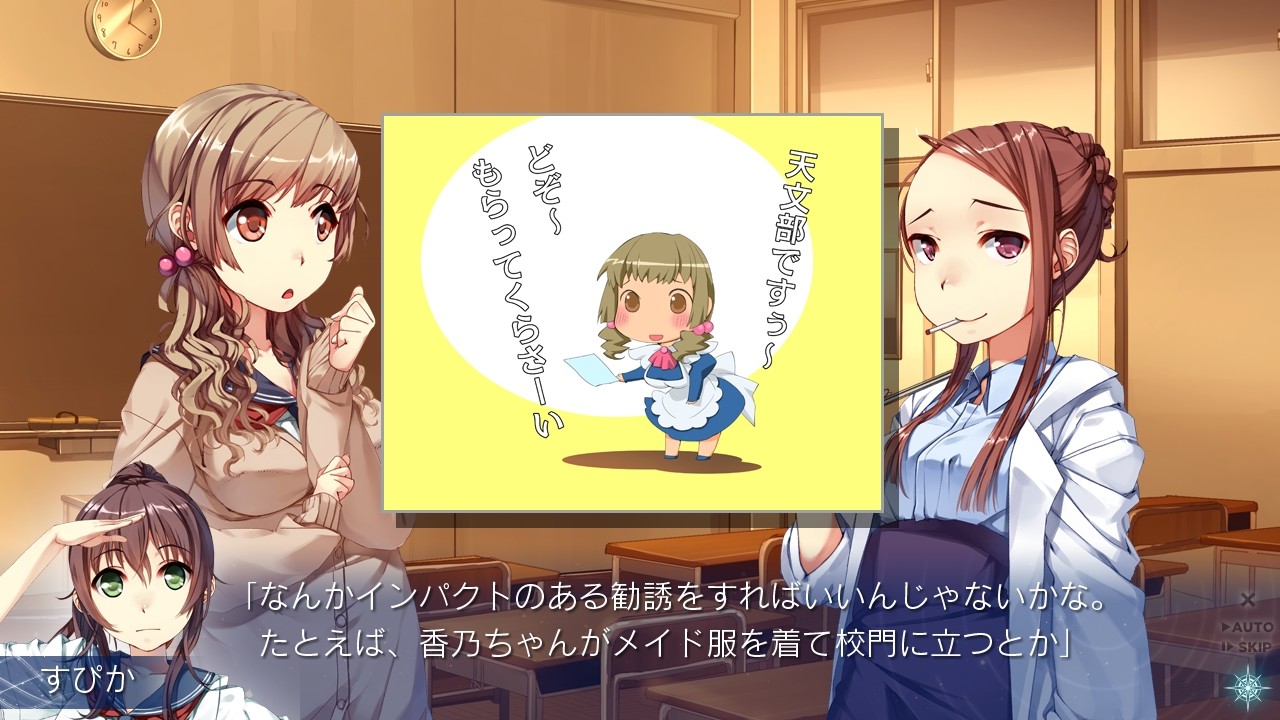 Hitoshi had been in Sakimihara Gakuen for three months and he still hadn’t joined a club. The astronomy club was in danger of disbanding due to the graduation of the third-year students and retirement of their advisor. He ended up being half-forced to join the club by the scheming of his older cousin and teacher Sakura. He met the other members of the club: energetic transfer student Supika, gentle neighbour Kano, shy senpai Sari, childish-looking but reliable Ayane. They were all new to astronomy as well, so their first outings were full of fumbles. However, as time progressed, they gradually began to change.