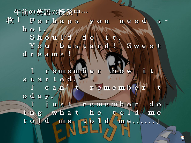 Meanwhile, you play the role of Masato, a regular high school student but very good at martial arts and kendo. After winning the national kendo tournament and defeating your best friend Ukyo (who is the son of this scientist as well as your finals opponent), you go to a cute girl called Sayaka, who you fell in love with, and state your confession. Surprisingly, Sayaka also have feelings for you so the 2 of you come along together very well. This all happens on June 1st, 1999. It all goes well and peaceful for 2 weeks until the absurd comes when serious of weird things and suspicious people start to evolve around you both. To make things short, the two of you run away to your room to "escape" all of these happenings, but unexpectedly a familiar shadow pops up in the darkness....this is just the prologue of a tragedy and a nightmare.