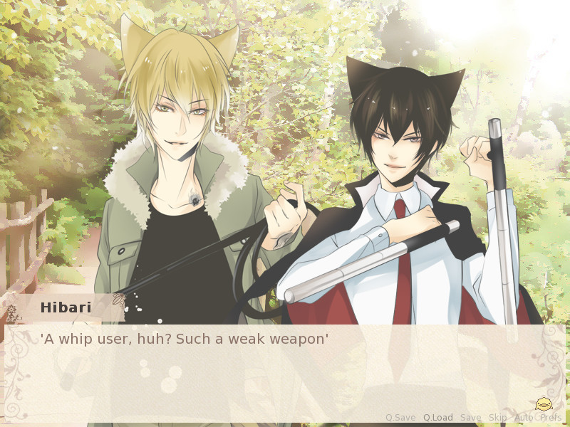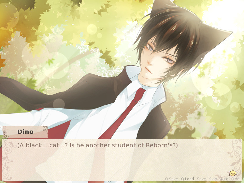 “A Story in the Forest" is a Dino x Hibari doujin game set in a parellel world different from that of the original series, Katekyo Hitman Reborn!. It plays like a dating sim with multiple endings, based on the decisions you make throughout the game (though the pairing remains Dino x Hibari).