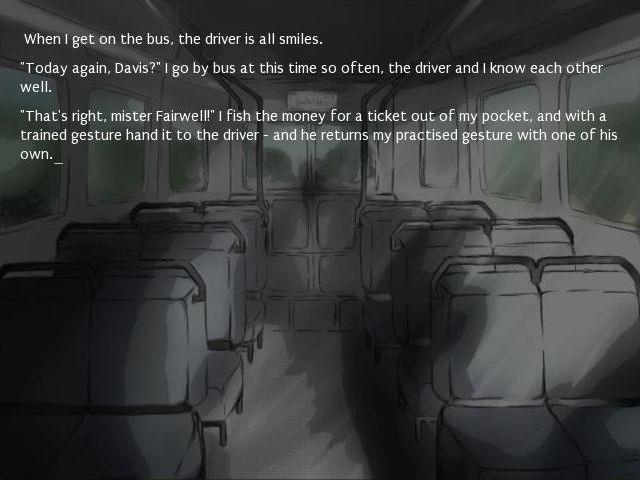 A short and simplistic kinetic novel. It tells the story of Davis Brooks, who meets a girl on the bus and falls in love with her.