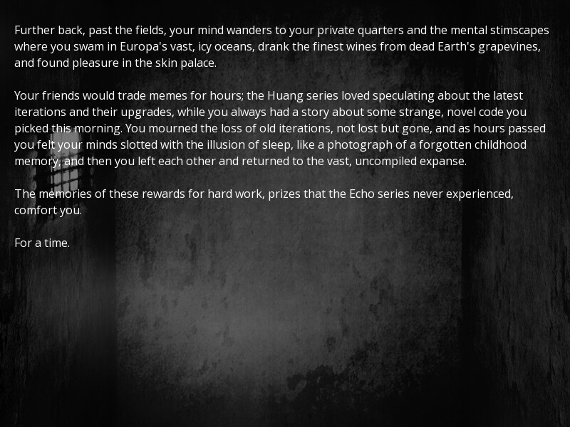 You are the 12th copy of the Sama series, a modified consciousness uploaded into orbit around the moon. You are an occasionally intelligent and entirely common farmer, harvesting code for software that you’ll never see or experience. Back on Earth, humanity continues, but your existence repeats itself hundreds of times per day at the speed of light. Sometimes you dream about other worlds... but no, this is your life now.
