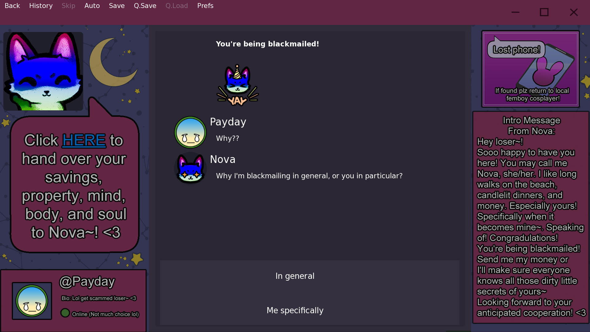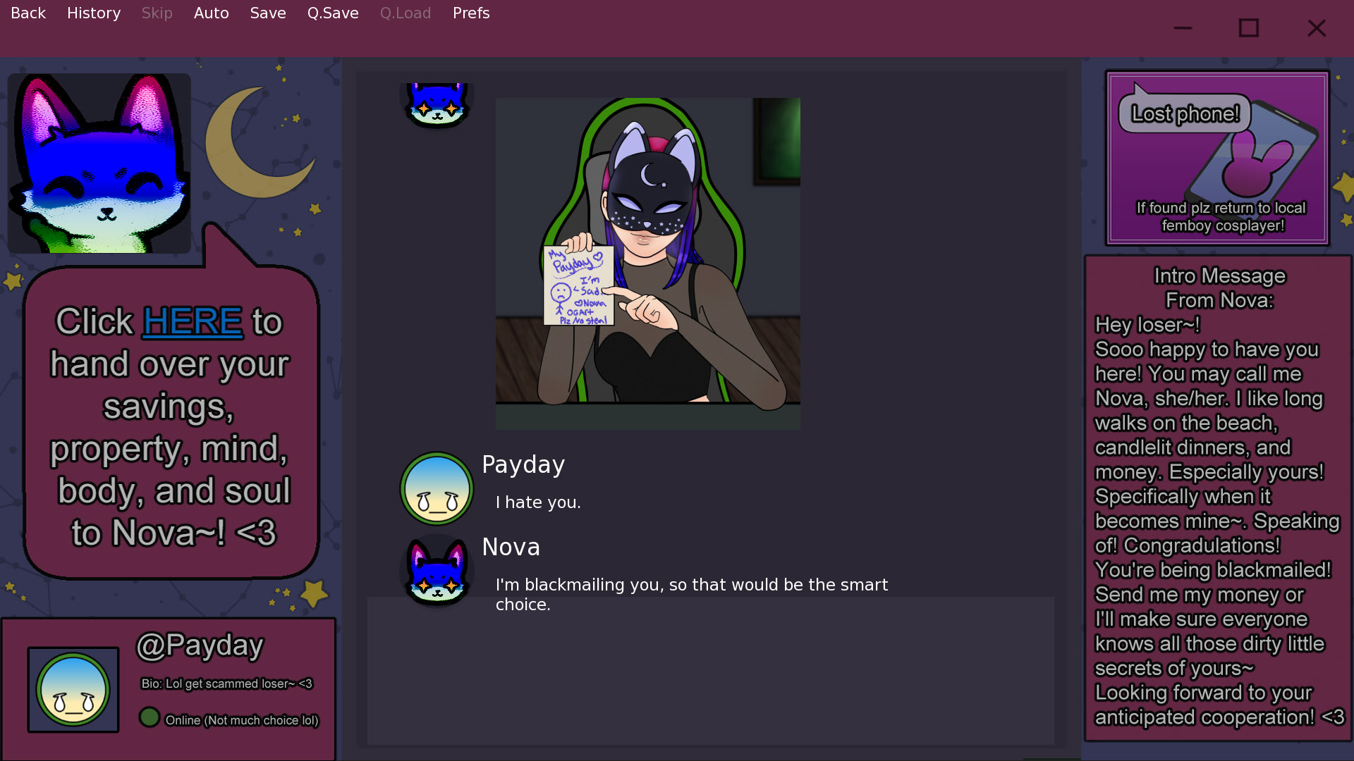 After a strange error message appears on your desktop you end up in a chatroom created by a woman who goes by 'Nova.' Due to your lack of funds and her own boredom you're now locked into a deal where you have to keep her entertained in order to keep your secrets from getting revealed!