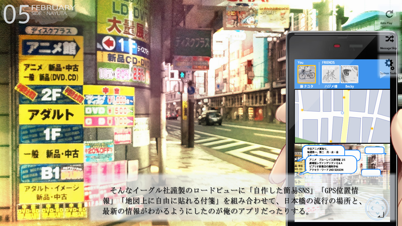 Nayuta lives with his mother in the not-too-distant Nipponbashi in Osaka while working on creating apps for smartphones. The Nipponbashi Street Festival (Sutofes) has had growing attendance over the years, but it has particularly garnered a lot of attention this year with the expansion of the underground shopping centre, being featured in the world’s premier internet company Eagle-sha’s real map web service Roadview and also being supported by the mayor. Nayuta and his friend Hajime went to the underground idol concert and met the idol Rikka, and he was charmed by her song. He also happened to met a new system engineer from Eagle-sha, Chisato, with whom he had often chatted online.