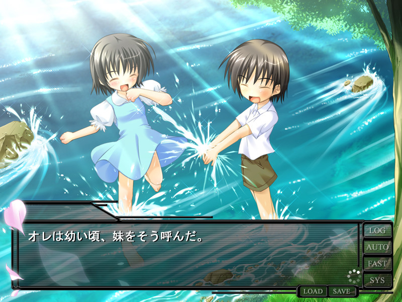 Main character is in good relations with his sister and her childhood friend. Emotions for sister eventually overflow into forbidden love... vndbreview]