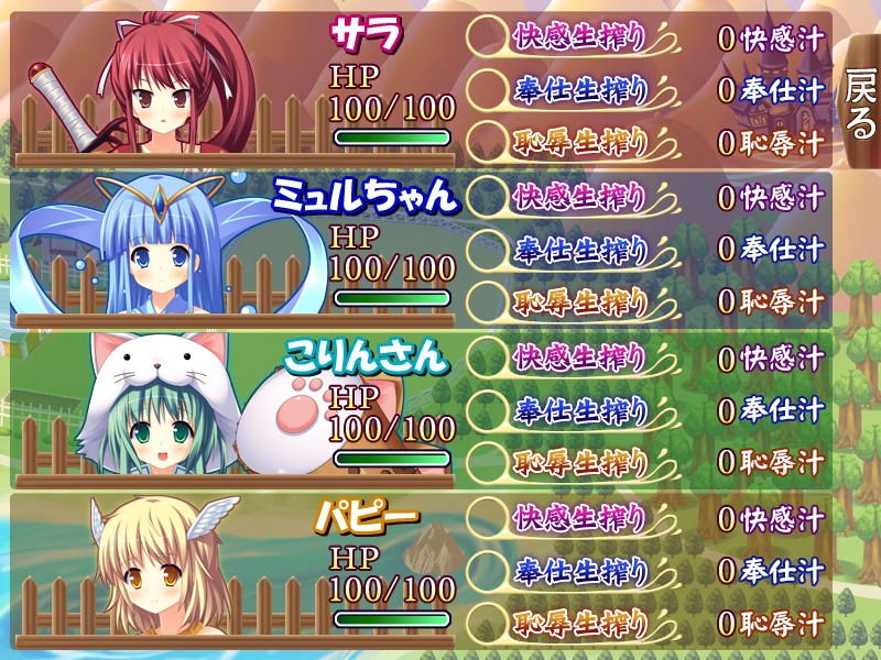 Cum on down to the peaceful Bukkake Ranch, a good old farm out of the way from all the commotion and hubbub of the town, a place where you can relax and enjoy a quiet life with your four elementals: the salamander girl, Sara, the slime girl, Myil, the kobold, Korin, and the harpy, Papy. Life is good...