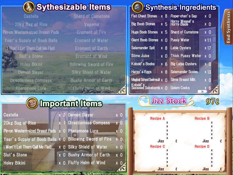 Cum on down to the peaceful Bukkake Ranch, a good old farm out of the way from all the commotion and hubbub of the town, a place where you can relax and enjoy a quiet life with your four elementals: the salamander girl, Sara, the slime girl, Myil, the kobold, Korin, and the harpy, Papy. Life is good on the farm. That is, until the Demon Queen shows up your front lawn, demanding you create the legendary Slut’s Stone before she decides to wipe your farm off the map.