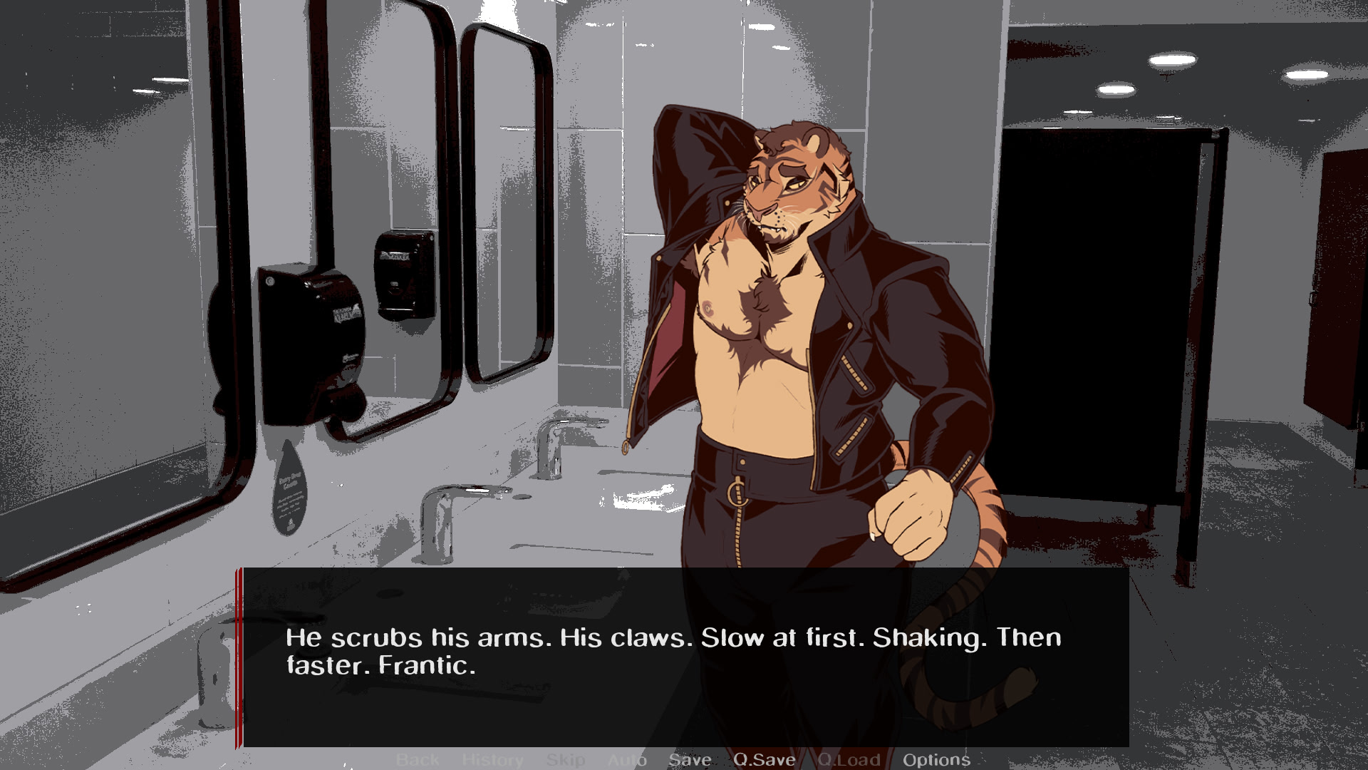 Bloodsuckers is a linear furry visual novel that melds love, loss, and murder. Bare the fangs of tiger and vampire Elias as he infiltrates a mysterious compound, his mind centered on one thing. The Hunt.
