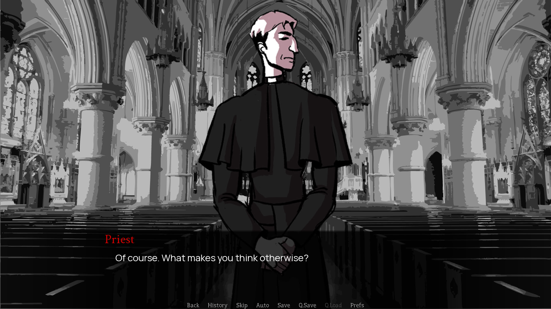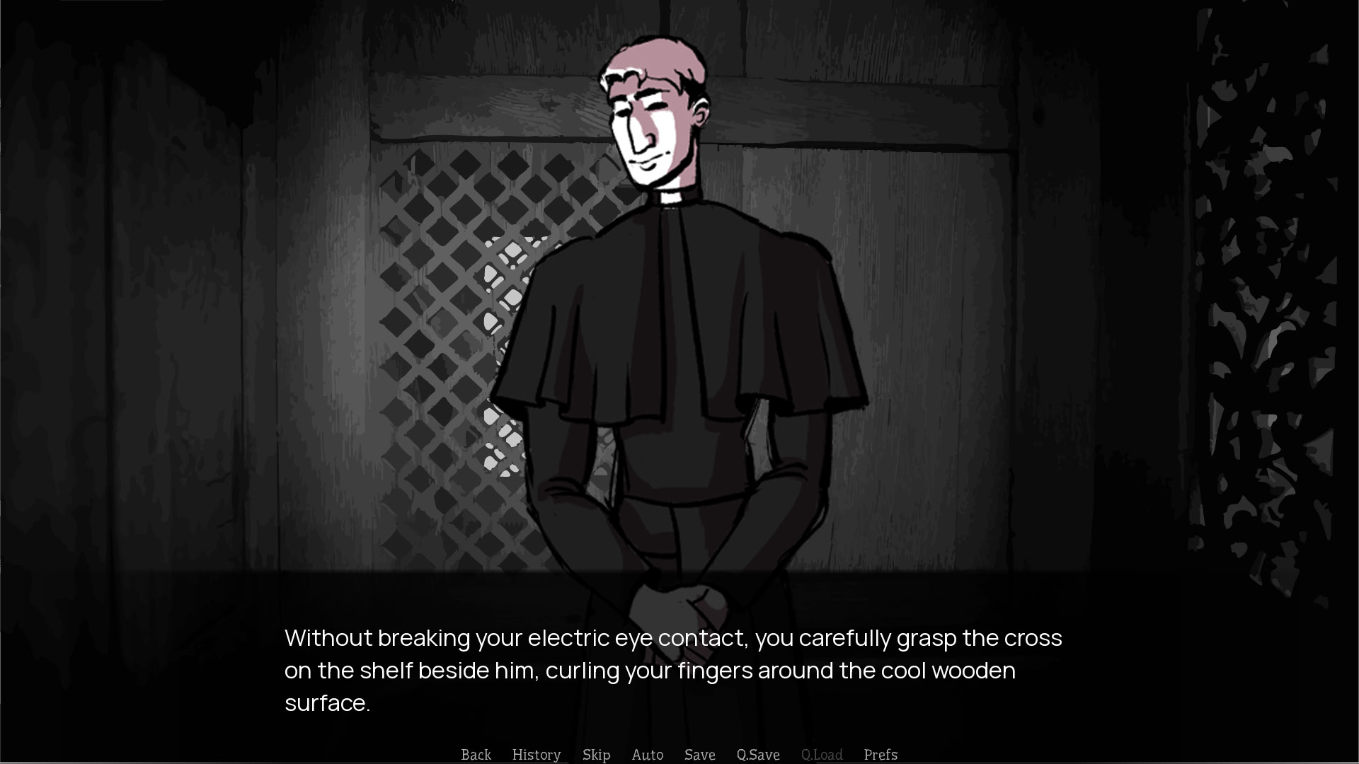 You are a vampire hunter in this noir tale, and tonight you are confronting a suspect to determine if your hunch is correct. Your suspect is a priest at a local church. How he is able to walk among those holy halls is the question.