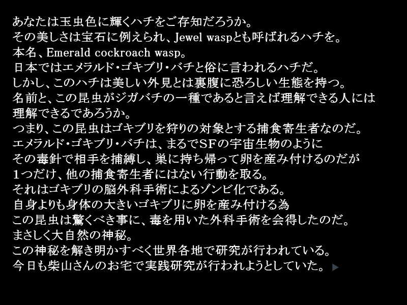 The story of a man who experimented with the spawn of the elusive Emerald Cockroach Bee... Today he researches at the home of Ms. Shibayama...