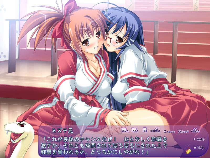 Main character receives a parcel that contains a double-headed snake that possesses his head. So when he reunites with two shrine maiden distant relatives, snake poisons his mind with sex thoughts. vndbreview]